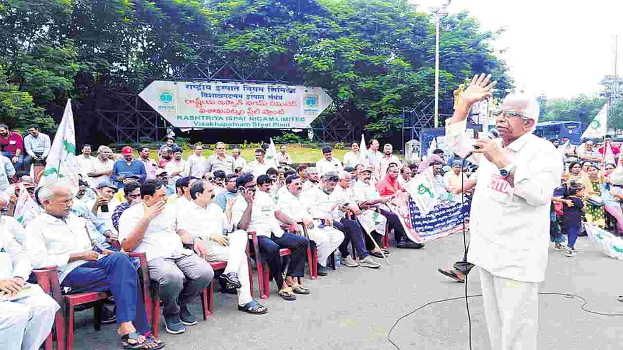 ఉక్కు పోరాట కమిటీ చైర్మన్ డి.ఆదినారాయణ మాట్లాడుతూ నాడు ప్రతిపక్షంలో ఉన్న కూటమి పార్టీలు ఇచ్చిన హామీలను తప్పారన్నారు. ఎంపీలు, ఎమ్మెల్యేలు, చేస్తున్న వింత ప్రకటనలతో ఉక్కు కార్మికుల మనోభావాలు దెబ్బతింటున్నాయన్నారు. ఉక్కు యాజమాన్యం అనుసరిస్తున్న విధానాలతో అస్తవ్యస్త పరిస్థితులు నెలకొన్నాయని, వాటిని సత్వరం పరిష్కరించే దిశగా రాష్ట్ర ప్రభుత్వం కేంద్రంపై ఒత్తిడి తేవాలన్నారు. పోరాట కమిటీ చైర్మన్ మంత్రి రాజశేఖర్ మాట్లాడుతూ ఉపాధి లభిస్తుందని నాటు కారు చౌకగా భూములిచ్చిన నిర్వాసితులను మోసం చేయడం దారుణమన్నారు. ఈవోఐలను తక్షణమే రద్దుచేయాలన్నారు. స్టీల్ సీఐటీయూ గౌరవాధ్యక్షుడు జె.అయోధ్యరామ్ అధ్యక్షతన జరిగిన ఈ కార్యక్రమంలో ఐద్వా రాష్ట్ర నేత పి.మణి, పోరాట కమిటీ నాయకులు నీరుకొండ రామచంద్రరావు, యు.రామస్వామి, ఎన్.రామారావు, గణపతిరెడ్డి, ఇంటక్ రమణమూర్తి, వి.ప్రసాద్, జె.రామకృష్ణ, దొమ్మేటి అప్పారావు, సీహెచ్ సన్యాసిరావు, తదితరులు పాల్గొన్నారు.
