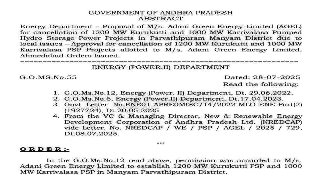 పార్వతీపురం మన్యం జిల్లాలో రెండు హైడ్రో పవర్ ప్రాజెక్టులు రద్దు