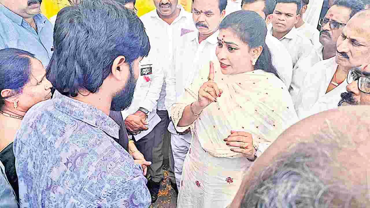 మండలంలోని పెట్టుగోళ్లపల్లి గ్రామంలో జల్జీవన్ పథకం పనుల్లో భాగంగా నూతనంగా నిర్మించిన వాటర్ ట్యాంకు మెట్ల మార్గం కింద భాగంలో పెచ్చులూడడం, లీకేజీ రావడంపై హోం మంత్రి వంగలపూడి అనిత ఆగ్రహం వ్యక్తం చేశారు. బుధవారం మధ్యాహ్నం ఆ వాటర్ ట్యాంకును ప్రారంభించడానికి వచ్చిన ఆమె నాసిరకం నిర్మాణంపై అసహనం వ్యక్తం చేసి కాంట్రాక్టర్పై మండిపడ్డారు.