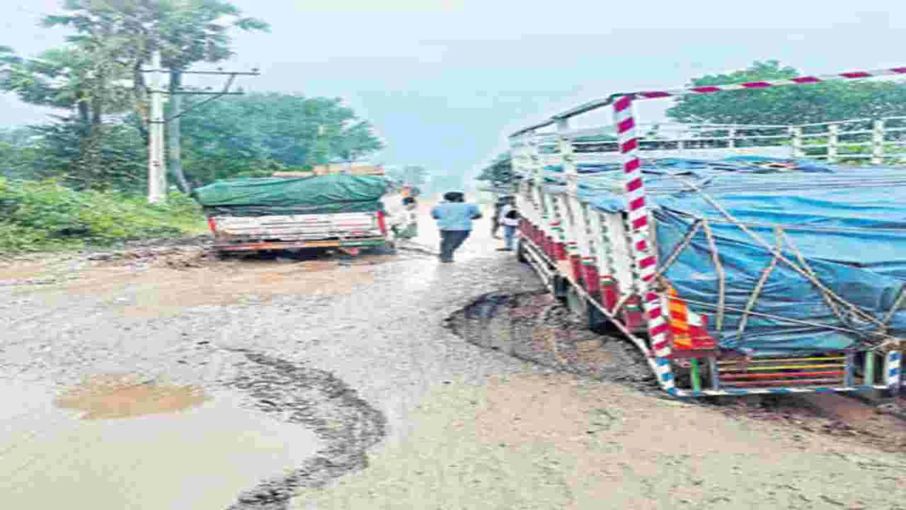 బుచ్చెయ్యపేట మండలం వడ్డాది నుంచి మాడుగుల మండలం తాటిపర్తి వరకు ఆర్అండ్బీ రహదారిపై పలుచోట్ల గోతులు ఏర్పడి దారుణంగా తయారైంది. మాడుగులతోపాటు అల్లూరి సీతారామరాజు జిల్లాలో పాడేరుతోపాటు పలు మండలాల ప్రజలు ఈ రోడ్డు మీదుగానే అనకాపల్లి, విశాఖ ప్రాంతాలకు రాకపోకలు సాగిస్తుంటారు. వివిధ రకాల రవాణా వాహనాలు కూడా వెళుతుంటాయి. రహదారిపై ఏర్పడిన గోతులను మెటల్, తారు/ సిమెంట్తో కప్పకుండా, మట్టిపోసి వదిలేశారు. దీంతో వర్షం కురిస్తే వాహనాలు మట్టిలో కూరుకుపోయి, ట్రాఫిక్ స్తంభిస్తున్నది. శుక్రవారం ఉదయం ఐదు గంటల సమయంలో మైదాన ప్రాంతం నుంచి ఒక లారీ, మినీ వ్యాను పాడేరు వెళుతున్నాయి. ఎం.కోడూరు వద్ద రోడ్డుపై వున్న బురద గోతుల్లో పక్కపక్కనే దిగబడిపోయాయి. రెండు లారీల మధ్య చిన్నపాటి ఖాళీ మాత్రమే వుండడంతో దిచక్ర వాహనాలు మినహా మరే ఇతర వాహనాలు వెళ్లలేని పరిస్థితి నెలకొంది. ఇరువైపులా సుమారు కిలోమీటరు మేర పెద్ద సంఖ్యలో వాహనాలు నిలిచిపోయాయి. దీంతో వివిధ పనుల నిమిత్తం వెళ్లే వారికి ఏం చేయాలో పాలుపోలేదు. వీరిలో కొంతమంది అనకాపల్లి, విశాఖపట్నం నుంచి దూర ప్రాంతాలకు రైళ్లలో వెళ్లాల్సి వారు వున్నారు. తాము ఎక్కడకుండానే రైళ్లు వెళ్లిపోతాయేమోనని ఆందోళన చెందారు. బురదలో కూరుకుపోయిన వాహనాల సిబ్బంది, స్థానికుల సాయంతో ఎక్స్కవేటర్ను రప్పించి బురదలో నుంచి వాహనాలను బయటకు తీయించారు. సుమారు రెండు గంటల తరువాత వాహనాలు కదిలాయి. సర్పంచ్ గొల్లవిల్లి సంజీవరావు కంకరరాళ్లను రప్పించి గోతులు కప్పించారు.