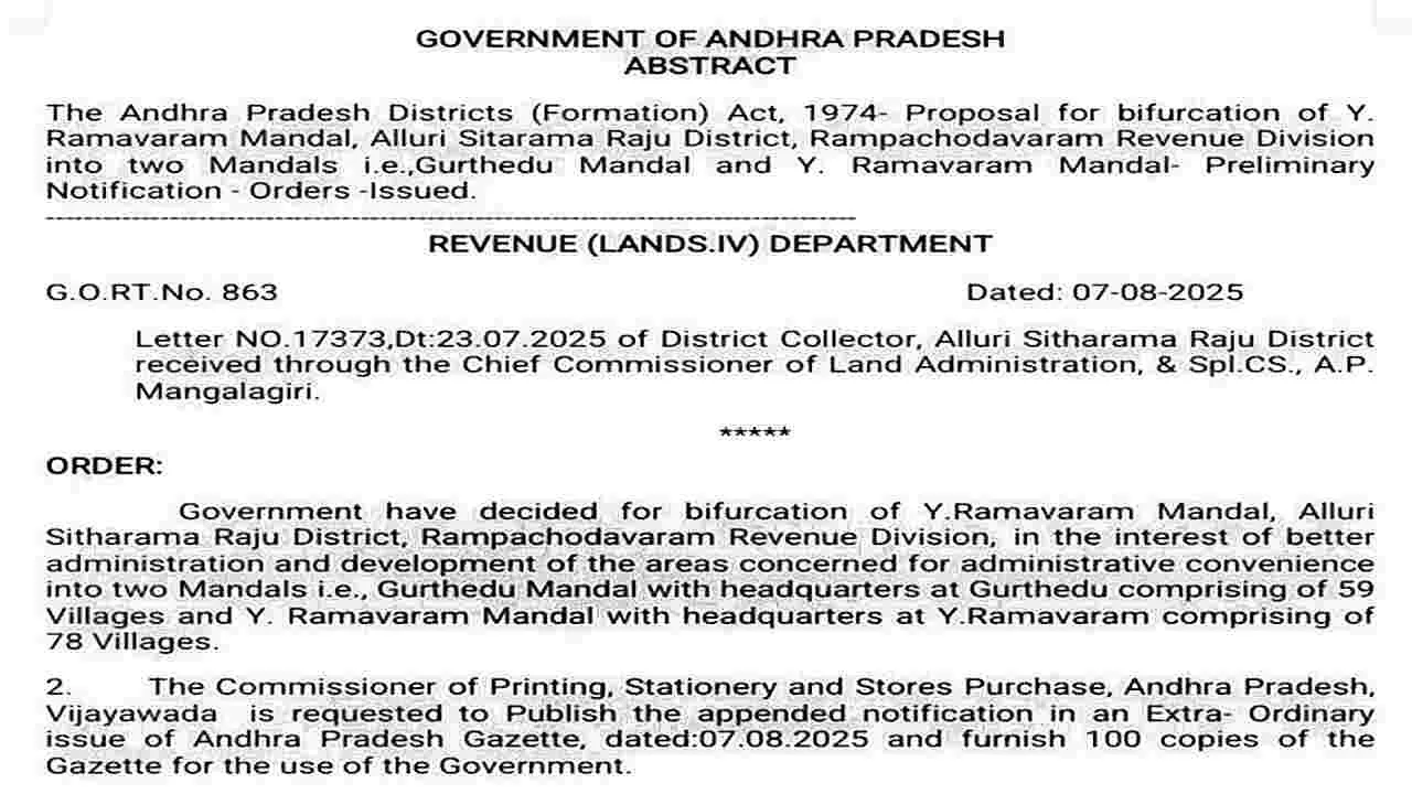 పాడేరు, ఆగస్టు 7(ఆంధ్రజ్యోతి): గుర్తేడు పేరిట జిల్లాలో కొత్తమండలం ఏర్పాటు కానుంది. దీనికి సంబంధించి ఇటీవల కేబినెట్ భేటీలో ఆమోదం తెలపగా, గురువారం అందుకు సంబంధించిన జీవో(ఆర్టీ నెంబర్: 863)ను ప్రభుత్వం జారీ చేసింది. జిల్లాలోని పాడేరు డివిజన్ పరిధిలో పాడేరు, జి.మాడుగుల, చింతపల్లి, జీకేవీధి, కొయ్యూరు, పెదబయలు, ముంచంగిపుట్టు, హుకుంపేట, అరకులోయ, డుంబ్రిగుడ, అనంతగిరి.. మొత్తం పదకొండు మండలాలున్నాయి. అలాగే రంపచోడవరం రెవెన్యూ డివిజన్ పరిధిలో రంపచోడవరం, దేవీపట్నం, వై.రామవరుం, అడ్డతీగల, మారేడుమిల్లి, రాజవొమ్మంగి, గంగవరం మొత్తం.. ఏడు మండలాలున్నాయి. చింతూరు రెవెన్యూ డివిజన్ పరిధిలో చింతూరు, కూనవరం, ఎటపాక, వీఆర్.పురం.. నాలుగు మండలాలున్నాయి. దీంతో జిల్లాలో మూడు రెవెన్యూ డివిజన్ల పరిధిలో ఇప్పటికి 22 మండలాలున్నాయి. అయితే రంపచోడవరం రెవెన్యూ డివిజన్ పరిధిలో ఉండే వై.రామవరం మండలంలో 137 గ్రామాలున్నాయి. దీంతో పాటు ఆయా గ్రామాలకు మండల కేంద్రం దూరంగా ఉండడంతో వై.రామవరాన్ని రెండు మండలాలుగా విభజించాలనే డిమాండ్ చాలా కాలంగా ఉంది. ఈ నేపథ్యంలో రాష్ట్ర ప్రభుత్వం వై.రామవరం మండలాన్ని రెండు మండలాలుగా ఏర్పాటు చేసేందుకు అంగీకరిస్తూ కేబినెట్లోనూ ఆమోదం తెలిపింది. దీంతో ఈ మండలంలో ఉన్న మొత్తం 137 గ్రామాల్లో 59 గ్రామాలను కలుపుతూ కొత్తగా గుర్తేడు కేంద్రంగా కొత్త మండలాన్ని ఏర్పాటు చేయాలని గురువారం ప్రభుత్వం జీవో జారీ చేసింది. దీంతో ఇకపై వై.రామవరం మండలంలో 78 గ్రామాలు, కొత్తగా ఏర్పడే గుర్తేడు మండలంలో 59 గ్రామాలుంటాయి. ఈ ప్రక్రియతో ఇన్నాళ్లుగా 22 మండలాలతో ఉన్న అల్లూరి సీతారామరాజు జిల్లా ఇకపై 23 మండలాలుగా మారనుంది. తమ ప్రాంత ఇబ్బందులను గుర్తించి వై.రామవరంలోని కొన్ని గ్రామాలతో ప్రత్యేకంగా గుర్తేడు మండలాన్ని ప్రకటించడంపై గిరిజనులు ఆనందం వ్యక్తం చేస్తున్నారు.
