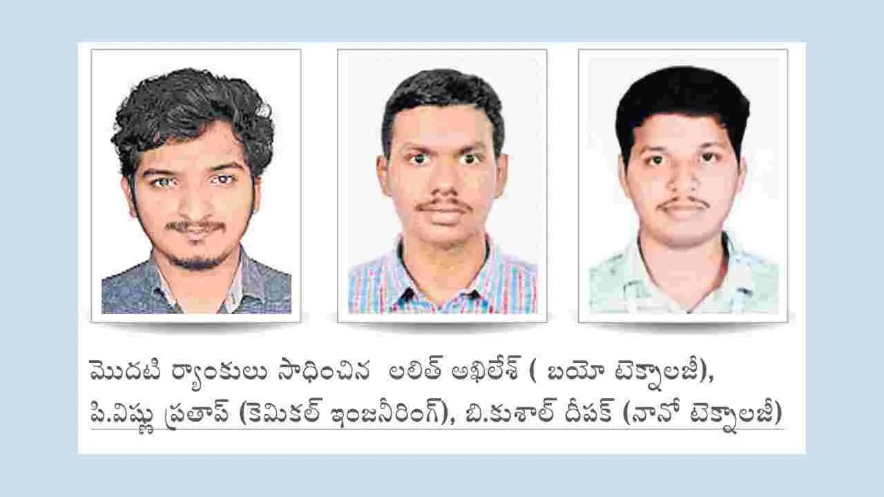 బయోటెక్నాలజీలో సీతమ్మధారకు చెందిన చాగంటి లలిత్ అఖిలేష్, గాజువాకకు చెందిన తామ్లక మైటీ రెండో ర్యాంకు సాధించారు. అలాగే, కెమికల్ ఇంజనీరింగ్ స్ర్టీమ్లో సీతమ్మధారకు చెందిన పి.విష్ణుప్రతాప్ మొదటి ర్యాంకు, గోపాలపట్నానికి చెందిన పలికల గణేష్ రెండో ర్యాంకు సాధించారు. అనకాపల్లి జిల్లా దేవరాపల్లికి చెందిన సబ్బవరపు సాయి ఈశ్వర్ ఆరో ర్యాంకు, విశాఖ నగర పరిధిలోని పోతినమల్లయ్యపాలేనికి చెందిన బోపల్లి శ్రీనివాసరావు, అనకాపల్లి జిల్లా పరవాడ మండలం పెంటసీమ బోనంగి గ్రామానికి చెందిన నార్ల సాయిఆదిత్య పదో ర్యాంకు సాధించారు. కంప్యూటర్ సైన్స్ ఇంజనీరింగ్లో పెందుర్తికి చెందిన బాలిబాని సునీల్ మొదటి ర్యాంకు, సీతమ్మధారకు చెందిన అల్లు వెంకట హేమంత్ నాగేశ్వరనాయుడు పదో ర్యాంకు సాధించారు. ఫుడ్ టెక్నాలజీ స్ర్టీమ్లో గోపాలపట్నానికి చెందిన బత్తుల శ్రుతి గీత రెండో ర్యాంకు, అల్లూరి జిల్లా పెదబయలు ప్రాంతానికి చెందిన దుంబెరి భానుప్రసాద్ బాబి ఆరో ర్యాంకు, గాజువాకకు చెందిన ఈగల లిఖిత తొమ్మిదో ర్యాంకు సాధించారు. ఇన్స్ర్టుమెంటేషన్ స్ర్టీమ్లో గాజువాకకు చెందిన సరిపల్లి జాహ్నవి కీర్తి నాలుగో ర్యాంకు, తాటిచెట్లపాలేనికి చెందిన సదరం షర్మిత ఏడో ర్యాంకు సాధించారు. మెకానికల్ ఇంజనీరింగ్లో అనకాపల్లి జిల్లా చింతల గొర్లివానిపాలెం గ్రామానికి చెందిన బోకం కుషాల్ దీపక్ మూడో ర్యాంకు, అగనంపూడికి చెందిన కూడ ప్రశాంత్ తొమ్మిదో ర్యాంకు, కూర్మన్నపాలెం ప్రాంతానికి చెందిన ఈర్ల లీలా వంశీ పదో ర్యాంకు సాధించారు. మెటలర్జీ స్ర్టీమ్లో అగనంపూడికి చెందిన ఆకుల పవన్ మాదేవ్ ఐదో ర్యాంకు, కురుపాం మార్కెట్కు చెందిన నున్న శ్రీనివాస్ ఆరో ర్యాంకు, అనకాపల్లి జిల్లా దేవరాపల్లికి చెందిన బోడబల్ల నీరజ ఏడో ర్యాంకు, నగరంలోని దొండపర్తికి చెందిన నేబార్తి సూర్యప్రకాష్ ఎనిమిదో ర్యాంకు సాధించారు.