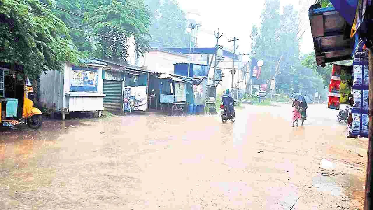 అనకాపల్లి టౌన్: అనకాపల్లిలో శనివారం మధ్యాహ్నం ఈదురుగాలులతో భారీ వర్షం కురిసింది. 34.0 మిల్లీమీటర్ల వర్షపాతం నమోదైనట్టు స్థానిక వ్యవసాయ పరిశోధనా కేంద్రం శాస్త్రవేత్తలు తెలిపారు. మధ్యాహ్నం వరకు 36.3 డిగ్రీల అత్యధిక ఉష్ణోగ్రతతో ఉన్న వాతావరణం మూడు గంటల సమయంలో ఒక్కసారిగా మారిపోయింది. ఆకాశమంతా కారుమేఘాలు కమ్ముకున్నాయి. ఈదురుగాలులు, ఉరుములు, మెరుపులతో భారీ వర్షం కురిసింది. సుమారు 45 నిమిషాల పాటు ఈదురుగాలులతో వర్షం కురియడంతో అప్పటి వరకు అత్యధిక ఉష్ణోగ్రతతో ఇబ్బందులు పడ్డ జనం ఉపశమనం పొందారు. కారణంగా రహదారుల్లో ఎక్కడపడితే అక్కడ వర్షపునీరు నిలిచిపోయింది. రోడ్డుకు పల్లంగా ఉన్న ప్రాంతాల్లో నీరు నిలిచిపోవడంతో పాదచారులు రాకపోకలు సాగించేందుకు ఇబ్బందులు పడ్డారు. ఆర్టీసీ కాంప్లెక్స్ ఆవరణ చెరువును తలపించేలా వర్షపునీరు నిలిచిపోయింది. దీంతో డిపోలోకి వెళ్లి వచ్చే కార్మికులు, ఉద్యోగులు ఇబ్బందులు పడ్డారు. అలాగే విజయరామరాజుపేట అండర్బ్రిడ్జి కింద వర్షపునీరు నిలిచిపోవడంతో అనకాపల్లి - చోడవరం మార్గాల మధ్య రాకపోకలు సాగించే వాహనచోదకులు అవస్థలు పడ్డారు. వర్షం కారణంగా పలు ప్రాంతాల్లో విద్యుత్ సరఫరాకు కొంత సేపు అంతరాయం ఏర్పడింది.