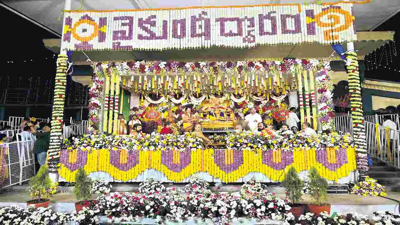 ముక్కోటి ఏకాదశి సందర్భంగా సింహాచలం వరాహ లక్ష్మీనృసింహస్వామి మంగళవారం ఉత్తరద్వారంలో వైకుంఠవాసుడిగా దర్శనమిచ్చారు. అధికారులు ముందుగా ప్రకటించిన మేరకు సోమవారం రాత్రి ఒంటిగంటకే సుప్రభాత సేవతో స్వామివారిని మేల్కొలిపి ధూపసేవ, సేవాకాలం, నిత్యహోమం వంటి ప్రభాత ఆరాధనలు పూర్తిచేశారు. ఆలయ అలంకారి ఉత్సవమూర్తి గోవిందరాజస్వామిని శంఖు, చక్ర, గదాయుధాలు, కటి హస్తాలు, సకల ఆభరణాలు, పరిమళ భరిత పుష్పమాలికలతో కాలుపై కాలు వేసుకుని కూర్చున్న రాజ భంగిమలో అలంకరించిన తీరు కట్టిపడేసింది. అనంతరం బంగారు తొళ్ళక్కియాన్లో ఉత్సవమూర్తిని ఏడు మేలి ముసుగుల మధ్య ఉంచి, ఉభయ దేవేరులతో అధిష్ఠింపజేశారు. పండితుల వేద మంత్రోచ్ఛారణలు, సంకీర్తనలు, నాదస్వరాలపనలు, భక్తుల గోవిందనామస్మరణ నడుమ బేడామండప తిరువీధి నిర్వహించారు. ఆ మార్గంలో పూజలు చేసి, ఒక్కో ముసుగును తొలగించారు. ఆలయ ఉత్తర ద్వారంలో ఆఖరి ముసుగును తొలగించి వైకుంఠవాసుడిగా అప్పన్న దర్శనాన్ని కల్పించారు. ఆలయ అనువంశిక ధర్మకర్త కుటుంబ సభ్యురాలు, విజయనగరం ఎమ్మెల్యే అదితి గజపతి, ఎమ్మెల్యేలు గంటా శ్రీనివాసరావు, గణబాబు, ఈవో సుజాత తొలిదర్శనం చేసుకున్నారు. అనంతరం స్వామివారిని ఉత్తర రాజగోపురంలో ప్రత్యేకంగా తీర్చిదిద్దిన వేదికపై ఉంచి మధ్యాహ్నం 12 గంటల వరకూ సామాన్య భక్తులకు దర్శన భాగ్యం కల్పించారు. సుమారు 30 వేల మంది తరలిరావడంతో క్యూలైన్లు కిక్కిరిశాయి. ఉత్సవానంతరం మాడవీధుల్లో తిరువీధి నిర్వహించారు. భక్తులకు పులుసు, పొంగలి ప్రసాదాలను పంపిణీచేశారు. స్థానాచార్యులు డా.టీపీ రాజగోపాల్, ఈఈలు సీహెచ్ వెంకటరమణ, బండారు రాంబాబు, డీఈఈ డీవీఎస్ రామరాజు, ఎస్.సన్యాసిరావు, ఏఈఓలు కె.తిరుమలేశ్వరరావు, వీబీ రమణమూర్తి ఏర్పాట్లను పర్యవేక్షించారు. డీసీపీ ప్రశాంతి, ఏసీపీ పృథ్వీతేజ్ ఆధ్వర్యంలో సుమారు 200 మంది పోలీసులు భద్రతా సేవలందించారు.