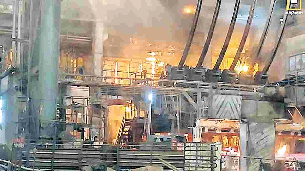స్టీల్ప్లాంటులోని స్టీల్ మెల్ట్ షాప్ (ఎస్ఎంఎస్)-2 విభాగంలో శుక్రవారం ఉదయం ఎనిమిది గంటల ప్రాంతంలో భారీ అగ్నిప్రమాదం సంభవించింది. కేబుళ్లు, యంత్ర సామగ్రి దగ్ధం కావడంతో ఉత్పత్తి నిలిచిపోయింది. ఇందుకు సంబంధించిన వివరాలిలా ఉన్నాయి. ఎస్ఎంఎస్-2 విభాగంలో నాలుగు కంటిన్యూ కాస్టింగ్ మెషీన్లు (సీసీఎం) ఉంటాయి. మూడింటిలో నిరంతరం ఉత్పత్తి సాగుతుంటుంది. ఒకటి స్టాండ్ బై గా ఉంటుంది. శుక్రవారం ఉదయం ఎనిమిది గంటలకు యథావిధిగా ఉత్పత్తి జరుగుతుండగా రెండో మెషీన్కు సంబంధించిన ట్యాంకు నుంచి హైడ్రాలిక్ ఆయిల్ను ఇతర భాగాలకు సరఫరా చేసే పైప్ లీకైంది. అత్యంత వేడిగా ఉండే హైడ్రాలిక్ ఆయిల్ కింద ఉన్న కేబుళ్లపై పడడంతో పెద్దఎత్తున మంటలు వ్యాపించాయి. ఒక్కసారిగా పెద్దఎత్తున మంటలు వ్యాపించడంతో విభాగంలో విధులు నిర్వర్తిస్తున్న ఉద్యోగులు పరుగులు తీశారు. సమాచారం అందుకున్న స్టీల్ప్లాంట్ సీఐఎస్ఎఫ్ సిబ్బంది సంఘటనా స్థలానికి చేరుకుని మంటలను అదుపుచేశారు. ఈ ప్రమాదంలో కేబుళ్లు, హైడ్రాలిక్ హోస్పైపులు కాలిపోయాయి. ప్రమాదం జరిగిన వెంటనే అధికారులు విభాగానికి విద్యుత్ సరఫరా ఆపేశారు. దీంతో పెను ప్రమాదం తప్పిందని ఉద్యోగులు తెలిపారు. ఇదిలావుండగా ఎస్ఎంఎస్-2 విభాగంలో స్వల్ప అగ్నిప్రమాదం జరిగిందని, ఎటువంటి ఉత్పత్తి, ప్రాణ నష్టం జరగలేదని, అతి తక్కువ సమయంలో మళ్లీ పునరుద్ధరణ చర్యలు చేపట్టామని ఉక్కు యాజమాన్యం ఒక ప్రకటనలో తెలిపింది.