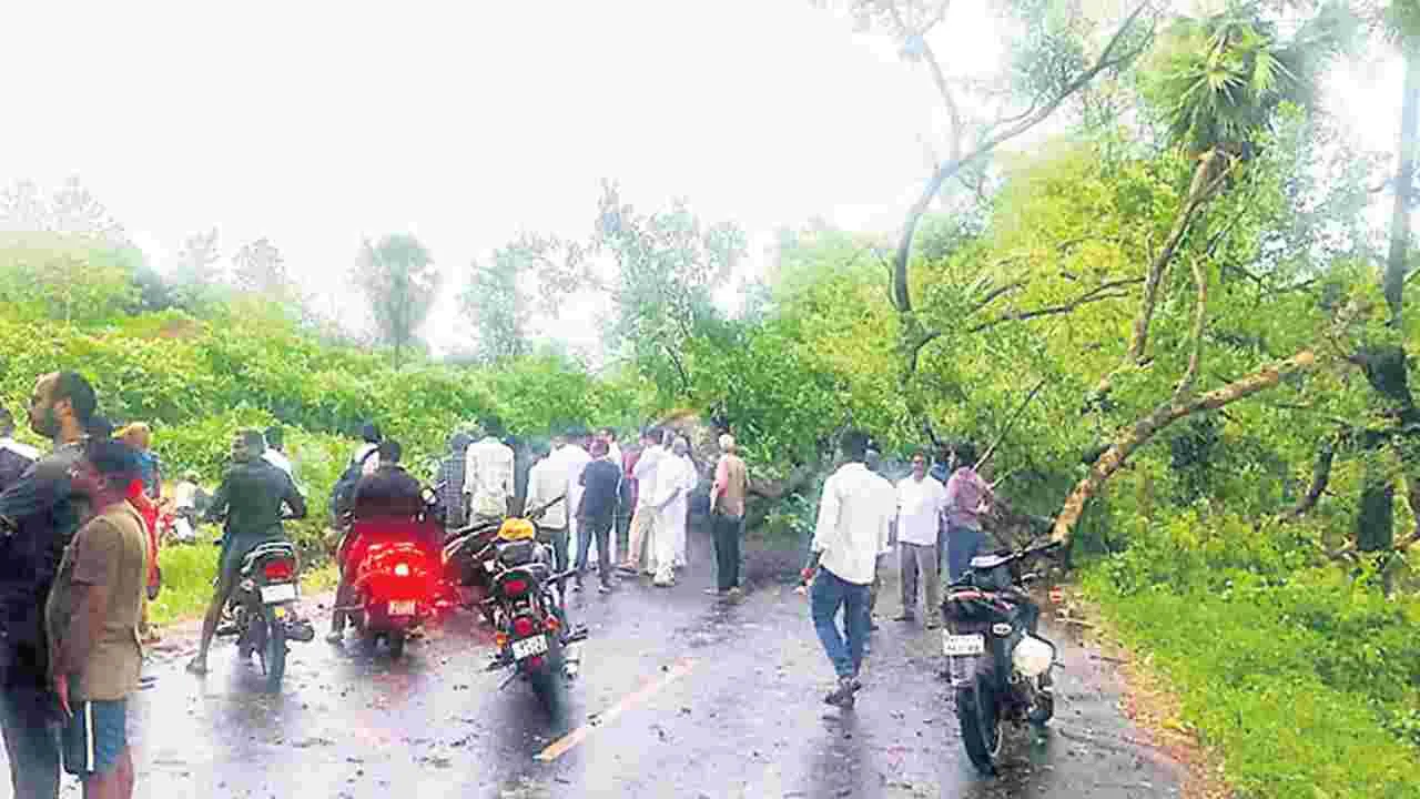 మండలంలో ఆదివారం సాయంత్రం ఈదురు గాలులు బీభత్సం సృష్టించాయి. వర్షం మోస్తరుగా పడినప్పటికీ పెను గాలులు వీచడంతో పలుచోట్ల చెట్టు, విద్యుత్ స్తంభాలు కూలిపోయాయి. అంతకుముందు ఉదయం నుంచి మధ్యాహ్నం వరకు ఎండతోపాటు ఉక్కపోత వాతావరణం నెలకొంది. సాయంత్రం నాలుగున్నర గంటల ప్రాంతంలో ఆకాశం మేఘావృతమైంది. తొలుత తేలికపాటి గాలులు వీచాయి. కొద్దిసేపటి తరువాత గాలుత తీవ్రత పెరిగింది. దీంతోపాటు ఉరుములు, పిడుగులతో వర్షం కురిసింది. వడ్డాది-పాడేరు ఆర్అండ్బీ రోడ్డులో తాటిపర్తి దాటిన తర్వాత గరికబంద వద్ద భారీ చింతచెట్టు రోడ్డుపై పడిపోయింది. దీంతో పాడేరు వైపు వాహనాల రాకపోకలు నిలిచిపోయాయి. ఆర్అండ్బీ అధికారులను కూలీలను పురమాయించి చెట్టు కొమ్మలను నరికివేయించారు. రాత్రి ఏడు గంటలకు వాహనాల రాకపోకలను పునరుద్ధరించారు. కాగా ఎం.కోడూరు, కూర్మనాఽథపురం వద్ద విద్యుత్ స్తంభాలు విరిగిపోయాయి. దీంతో విద్యుత్ సరఫరా నిలిచిపోయింది.