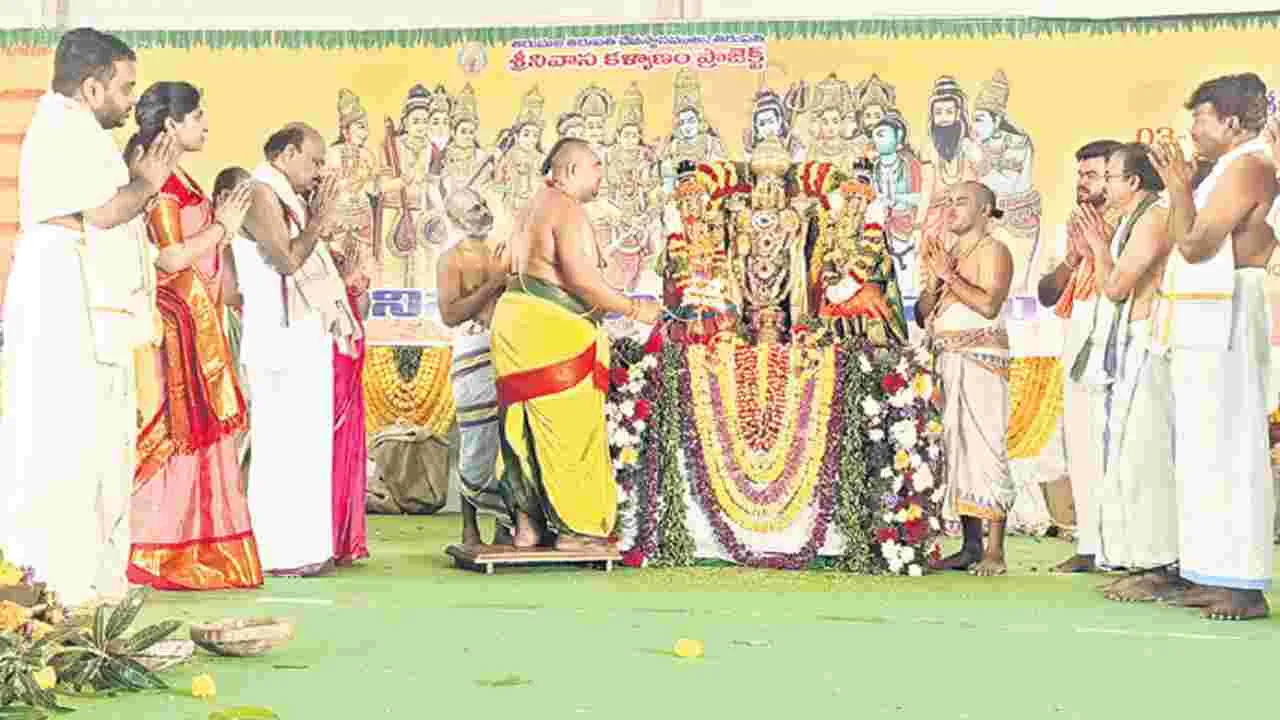 గోవింద నామస్మరణతో నర్సీపట్నం ఎన్టీఆర్ మినీ స్టేడియం సోమవారం రాత్రి మార్మోగింది. తిరుమల తిరుపతి దేవస్థానం ఆధ్వర్యంలో శ్రీనివాస కల్యాణ మహోత్సవాన్ని అంగరంగ వైభవంగా నిర్వహించారు. అంతకుముందు మేళతాళాలు, కోలాటాలు, భజన భృందాలతో శ్రీదేవి, భూదేవి సహిత వేంకటేశ్వరస్వామి వారి ఉత్సవ విగ్రహాలను శ్రీవారి సేవకులు పెదబొడ్డేపల్లి నుంచి ఎన్టీఆర్ మినీ స్టేడియం వరకు ఊరేగింపుగా తీసుకువచ్చారు. పుష్పాలతో అలంకరించిన ప్రత్యేక వేదికపై టీటీడీ అర్చకులు కృష్ణశాస్త్రి 6.55 గంటలకు స్వామి వారి కల్యాణ వేడుకలకు శ్రీకారంచుట్టారు. శాసనసభ స్పీకర్ చింతకాయల అయ్యన్నపాత్రుడు, పద్మావతి దంపతులు స్వామివారికి పట్టు వస్త్రాలు సమర్పించారు. తిరుపతి నుంచి వచ్చిన అర్చకుల బృందం, వేద పండితులు మంత్రోచ్ఛరణలతో స్వామి వారి కల్యాణం జరిపించారు. పెద్ద సంఖ్యలో హాజరైన భక్తులు తిరుమలలో శ్రీనివాసుని కల్యాణాన్ని స్వయంగా తిలకించిన అనుభూతి పొందారు. అన్నమయ్య కీర్తనలు, స్వామి భక్తి గీతాల ఆలాపనతో స్టేడియంలో ఆధ్యాత్మిక వాతావరణం నెలకొంది. ఈ కార్యక్రమంలో టీడీపీ రాష్ట్ర ప్రధాన కార్యదర్శి చింతకాయల విజయ్ దంపతులు, రాష్ట్ర గృహనిర్మాణ సంస్థ చైర్మన్ బత్తుల తాతయ్యబాబు, డీసీసీబీ పర్సన్ఇన్చార్జి కోన తాతారావు, దాడి రత్నాకర్, చింతకాయల రాజేశ్, తదితరులు పాల్గొన్నారు.