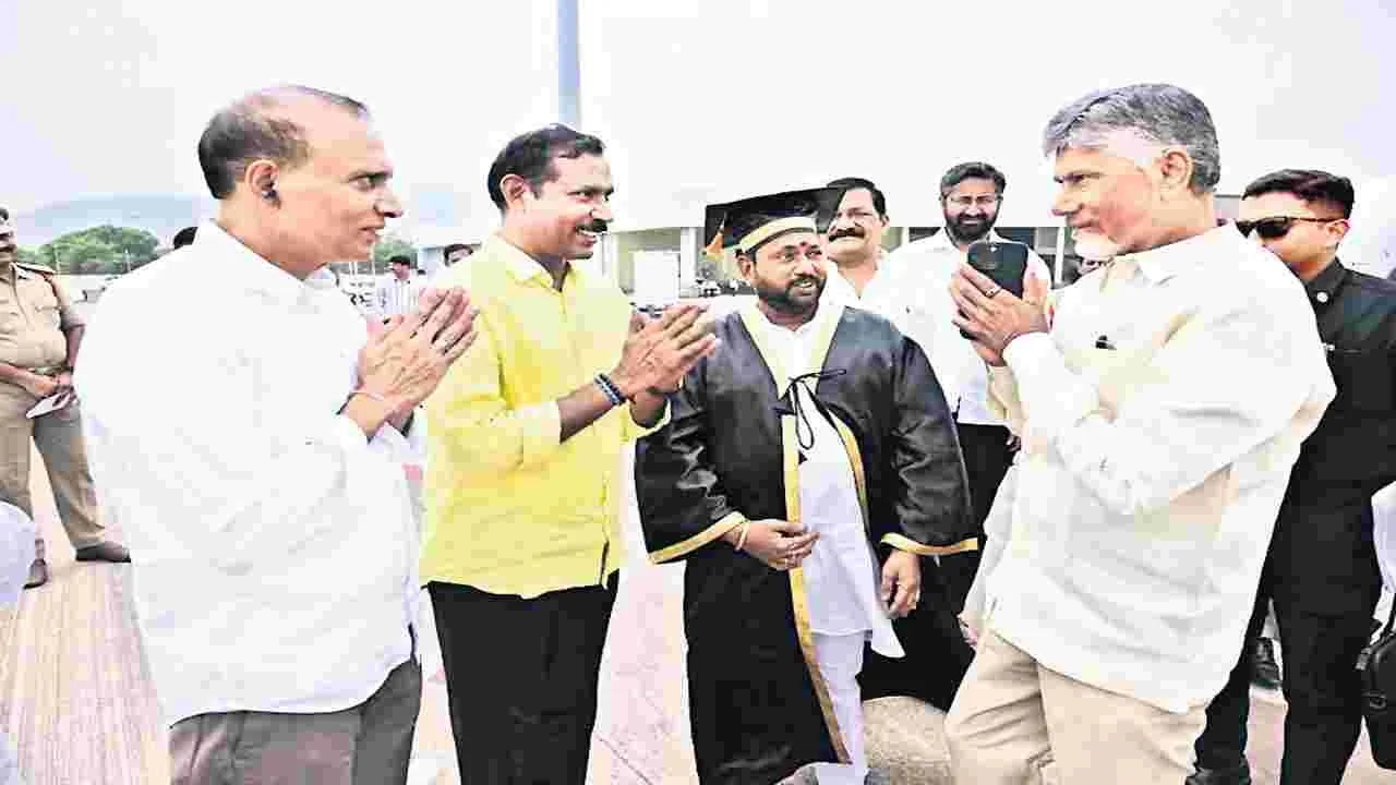 విజయనగరం జిల్లా పర్యటన నిమిత్తం బుధవారం విశాఖ చేరుకున్న ముఖ్యమంత్రి నారా చంద్రబాబునాయుడుకు విమానాశ్రయంలో కూటమి నేతలు, అధికారులు ఆత్మీయ స్వాగతం పలికారు. ముఖ్యమంత్రి ఢిల్లీ నుంచి ప్రత్యేక విమానంలో ఉదయం 11 గంటలకు విశాఖ చేరుకున్నారు. పార్టీ రాష్ట్ర అధ్యక్షులు, ఎమ్మెల్యే పల్లా శ్రీనివాసరావు, ఎంపీ ఎం.శ్రీభరత్, ఎమ్మెల్యేలు గంటా శ్రీనివాసరావు, పి.గణబాబు, మేయర్ పీలా శ్రీనివాసరావు, ఎన్టీఆర్ వైద్యసేవా ట్రస్ట్ వైస్ చైర్మన్ సీతంరాజు సుధాకర్, ఏపీ గ్రోవర్స్ ఆయిల్స్ అండ్ సీడ్స్ కార్పొరేషన్ చైర్మన్ గండి బాబ్జీ, సీఎంవో కార్యదర్శి ప్రద్యుమ్న, జిల్లా కలెక్టర్ ఎంఎన్ హరేంధిర ప్రసాద్, సీపీ శంఖబ్రత బాగ్చీ, తదితరులు ముఖ్యమంత్రికి ఆత్మీయ స్వాగతం పలికారు. అనంతరం 11.30 గంటలకు ఆయన హెలికాప్టర్లో బయలుదేరి విజయనగరం జిల్లాకు వెళ్లారు.