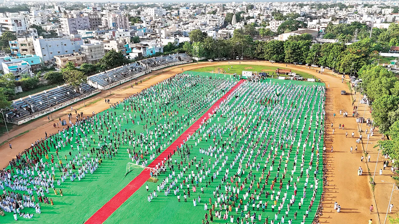 Health with Yoga యోగా సాధన ప్రతి ఒక్కరి జీవితంలో భాగం కావాలని, యోగాతోనే ఆరోగ్యంగా ఉంటామని కలెక్టర్ బీఅర్ అంబేడ్కర్ అన్నారు. నగరంలోని రాజీవ్ క్రీడాప్రాంగణంలో ఐదు వేల మందితో యోగాసనాలు వేయగా జిల్లాలో 5,775 కేంద్రాల్లో యోగా ప్రదర్శనలు శనివారం ఏర్పాటు చేశారు.
