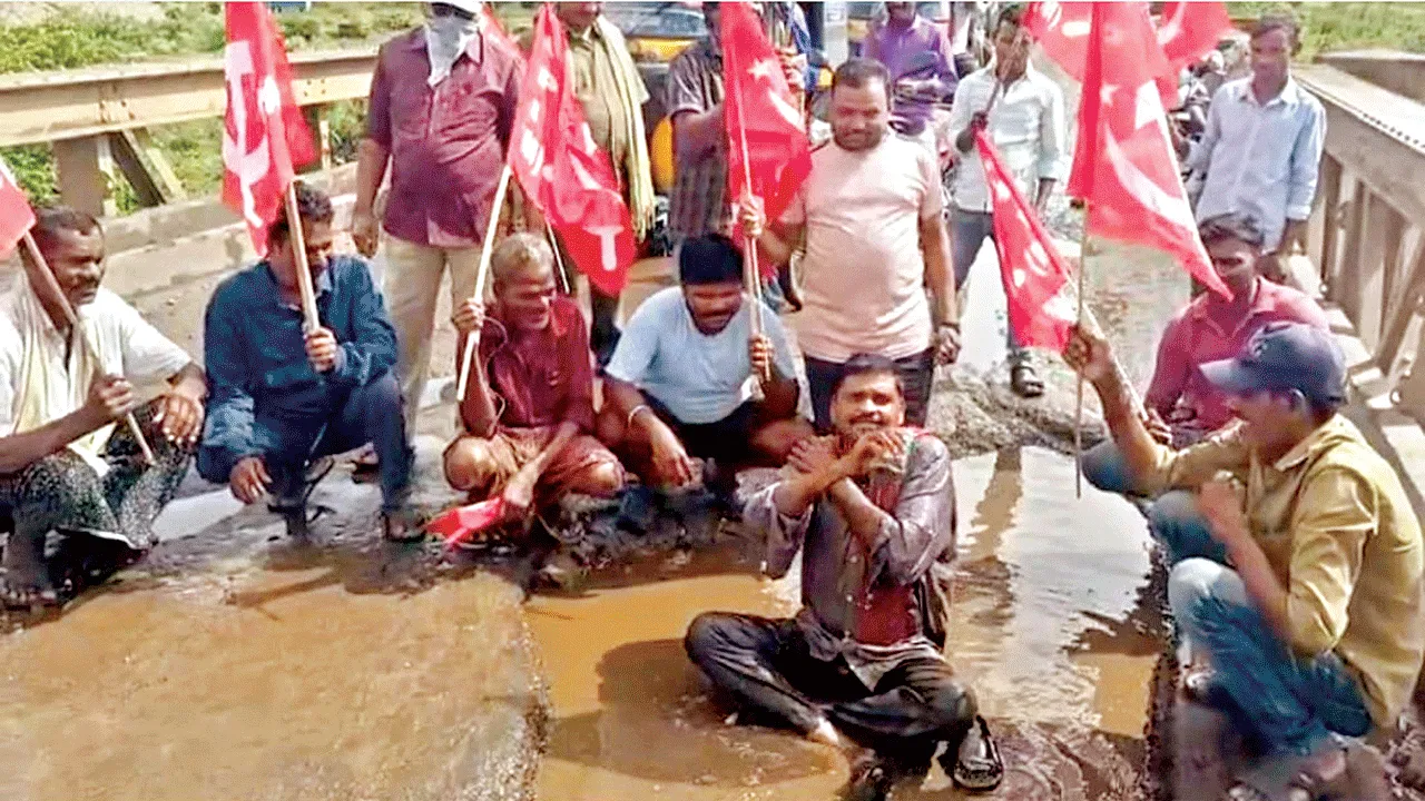 జియ్యమ్మవలస, మే 23 (ఆంధ్రజ్యో తి): కొమరాడ మండలం కోటిపాం వంతెనపై శుక్రవా రం సీపీఎం నాయ కులు ఆ సంఘం జిల్లా కార్యవర్గ సభ్యుడు కొల్లి సాంబమూర్తి ఆధ్వర్యంలో వినూ త్న నిరసన చేపట్టారు. బ్రిడ్జిపై ఉన్న గోతిలో స్నానం చేసి నిరసన తెలిపారు. ఈసందర్భంగా ఆయన మాట్లాడు తూ అంతర్ రాష్ట్ర రహదారి ఉన్న కొమరాడ మండలంలో రోడ్డు అత్యంత దారుణంగా ఉంద ని, ఎక్కడ చూసినా గోతులతో దర్శనమిస్తోంద ని ఆందోళన వ్యక్తం చేశారు. జూన్ 1వ తేదీలో గా బ్రిడ్జిపై ఉన్న భారీ గోతులను పూడ్చాలని, దీంతో పాటు రోడ్డు పూర్తిగా మరమ్మతులు చేయాలని ఆయన డిమాండ్ చేశారు. లేదంటే ఈ బ్రిడ్జి వద్దే తీవ్ర ఉద్యమం చేస్తామని, ఏది జరిగినా ప్రభుత్వమే బాధ్యత వహించా లన్నారు. ఈ కార్యక్రమంలో పలువురు సీపీఎం నాయకులు పాల్గొన్నారు.