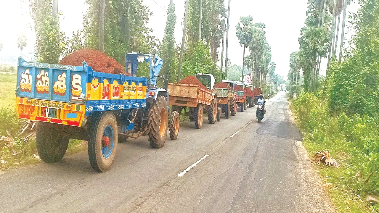 - ఎస్.కోట -బొడ్డవర రోడ్డులో నిలిచిన టాక్టర్లు అవి. ఎక్కడ నుంచో అక్రమంగా తవ్విన కంకరను తీసుకొచ్చాయి. సమీప పొలంలో వేసేందుకు ఒకదాని వెనక ఒకటి ఆగాయి. అదివారం నుంచి పదుల సంఖ్యలో ఈ టాక్టర్లు కంకరతో పట్టపగలే తిరుగుతున్నాయి. విశాఖ నుంచి అరకు వెళ్లే ప్రధాన రోడ్డు కావడంతో నిత్యం ప్రజాప్రతినిధులు, అధికారులు తిరుగుతూ ఉంటారు. అయినా ఈ టాక్టర్లు ఎవరికీ కనిపించడం లేదు.