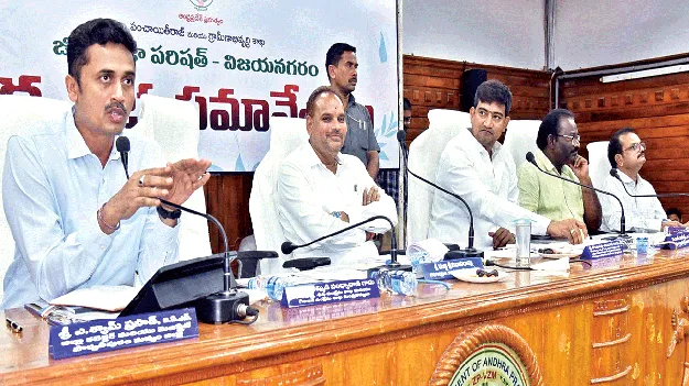 జడ్పీ సమావేశం అజెండాలో తొలి అంశంగా గ్రామీణ నీటి సరఫరా విభాగంపై సమీక్ష జరిగింది. విజయనగరం, పార్వతీపురం మన్యం జిల్లాలకు చెందిన ఎస్ఈలు తమ జిల్లాల్లో ఆర్డబ్ల్యూఎస్ ద్వారా జరుగుతున్న కార్యక్రమాలు, వేసవి నేపథ్యంలో తీసుకుంటున్న చర్యలపై వివరించారు. తాగునీటి అవసరాల కోసం అత్యవసరంగా ఖర్చు చేసేందుకు ప్రభుత్వం రూ.కోటి మంజూరు చేసిందని మంత్రి కొండపల్లి శ్రీనివాస్ చెప్పారు. ఉపాధి హామీ పథకంపై సమీక్షలో పలువురు ఎంపీపీలు, జడ్పీటీసీలు మాట్లాడుతూ ఉపాధి వేతనాల బకాయిల గురించి ప్రశ్నించారు. దీనిపై మంత్రి స్పందిస్తూ, ఉపాధి వేతనాలు ఈ నెలలోనే చెల్లించేందుకు ప్రభుత్వం ఏర్పాట్లు చేస్తోందన్నారు. కాగా జడ్పీ సర్వసభ్య సమావేశంలో 11 శాఖలపై సమీక్ష జరిగింది.