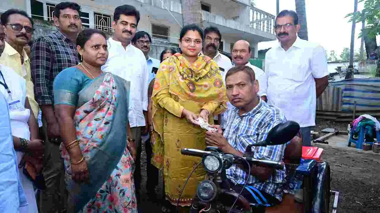 స్వయంగా పింఛన్లు అందించిన కలెక్టర్