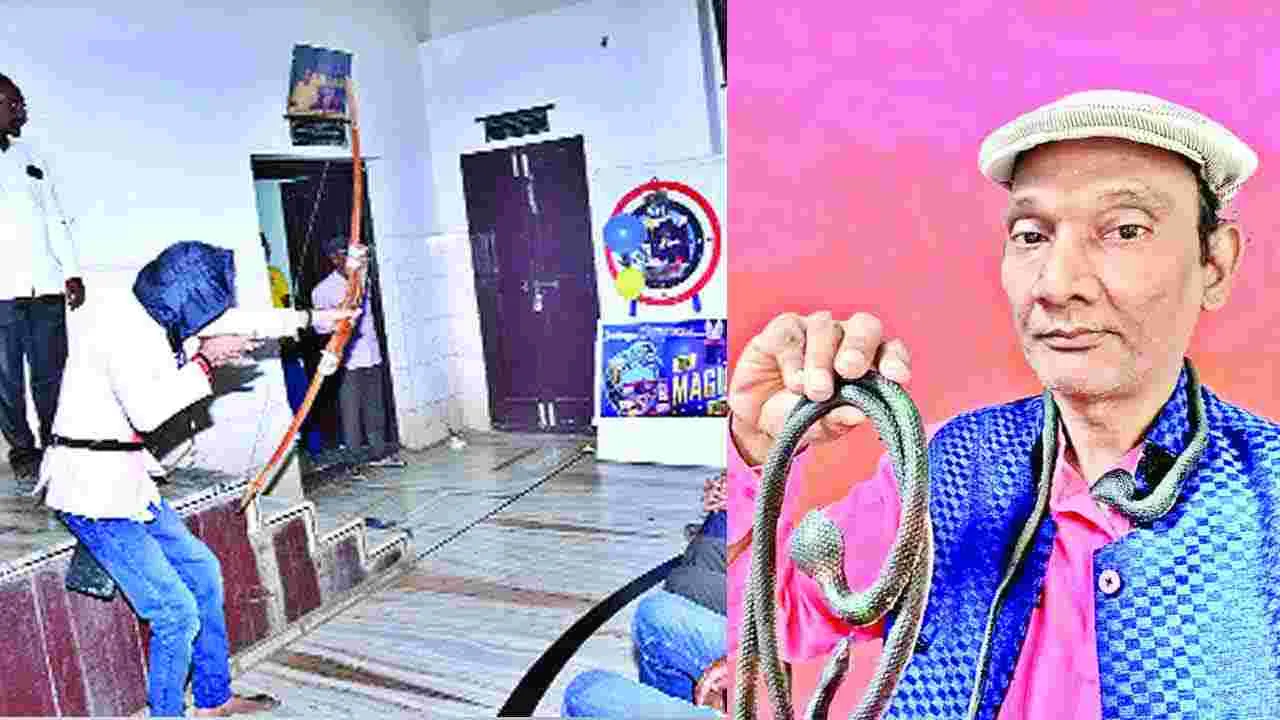 పాలకొల్లు అర్బన్,సెప్టెంబరు 13(ఆంధ్రజ్యోతి): కళ్లకు గంతలు కట్టుకుని బైక్ నడుపుతాడు.. బాణం వేస్తాడు.. అతని ప్రదర్శన చూస్తే కళ్లకు గంతలు కట్టినా చూస్తాడు అనిపిస్తుంది. అంత కచ్చితత్వంతో సాగే అతని ప్రదర్శన చూసేవారు ఊపిరి బిగబట్టాల్సిందే. పాలకొల్లు పట్టణానికి చెందిన పప్పుల దుర్గామల్లేశ్వరరావు (దుర్గేశ్) (Durgesh) విలువిద్య (ఆర్చరీ) కత్తిసాము, ఇంద్రజాల ప్రదర్శనలతో ఆకట్టుకుంటున్నారు. అతని తండ్రి వెంకట్రావు, తల్లి పద్మావతి. ఆయన తండ్రి కార్మిక నాయకుడిగా అందరికీ సుపరిచితం.