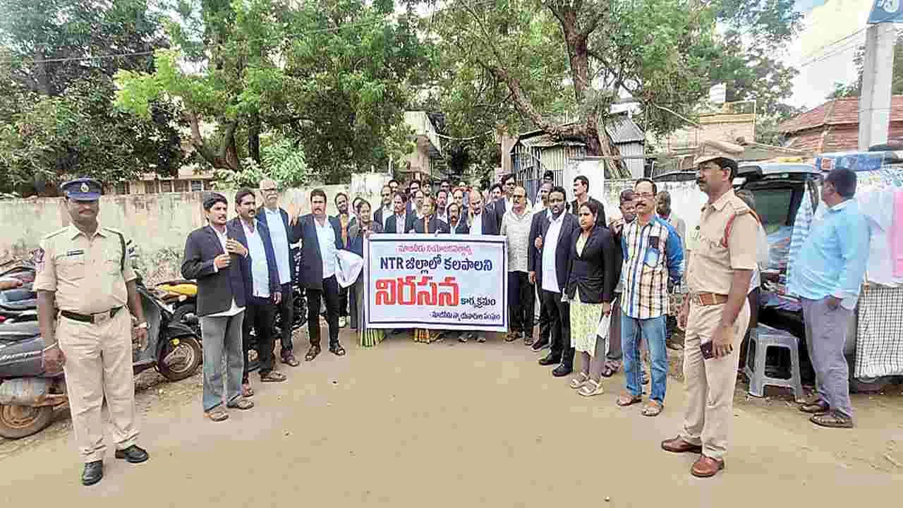 నూజివీడు నియోజకవర్గాన్ని ఎన్టీఆర్ జిల్లాలో విలీనం చేయాలని కోరు తూ నూజివీడు బార్ అసోసియేషన్ ఆధ్వర్యంలో న్యాయ వాదులు శుక్రవారం ఆందోళన చేపట్టారు.
