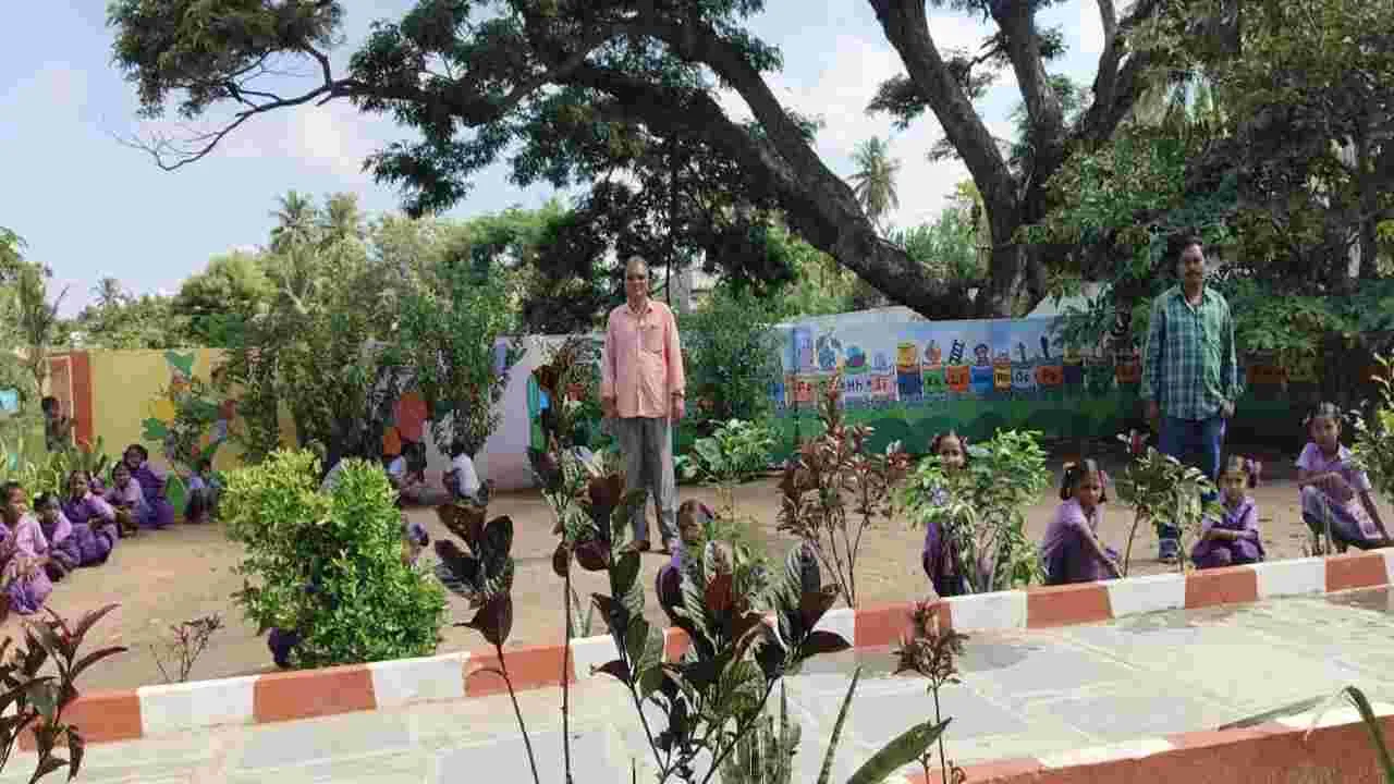 ముదినేపల్లి, జూన్ 3 (ఆంధ్రజ్యోతి): మండలంలోని పెయ్యేరు ప్రాథమిక పాఠశాల ఆవరణ పచ్చదనంతో కళకళలాడుతోంది. ముచ్చటగొలిపే కిచెన్ గార్డెన్ విశేషంగా ఆకట్టుకుంటుంది. ఉపాధ్యాయులు, విద్యార్థులు వివిధ రకాల పూలు, పండ్ల మొక్కల పెంపకం శ్రద్ధగా నిర్వహిస్తున్నారు. హెచ్ఎం బేతాళ రాజేంద్ర ప్రసాద్, ఉపాధ్యాయుడు చక్రధర్ ఆధ్వర్యంలో విద్యార్థులు మొక్కలను దత్తత తీసుకున్నారు. జామ, ఫైనాఫిల్ పండ్లతోపాటు కూరగాయల మొ క్కలు ఉన్నాయి. ప్రభుత్వ ఆదేశాల మేరకు పాఠశాల ఆవరణలో కిచెన్ గార్డెన్ నిర్వహణకు విద్యార్థులు పాఠశాల సమయానికి కంటే ముందే వస్తారు. సెలవుల్లో కూడా ఉపాధ్యాయులు, విద్యార్థులు మొక్కలకు నీళ్లు పోస్తున్నారు.