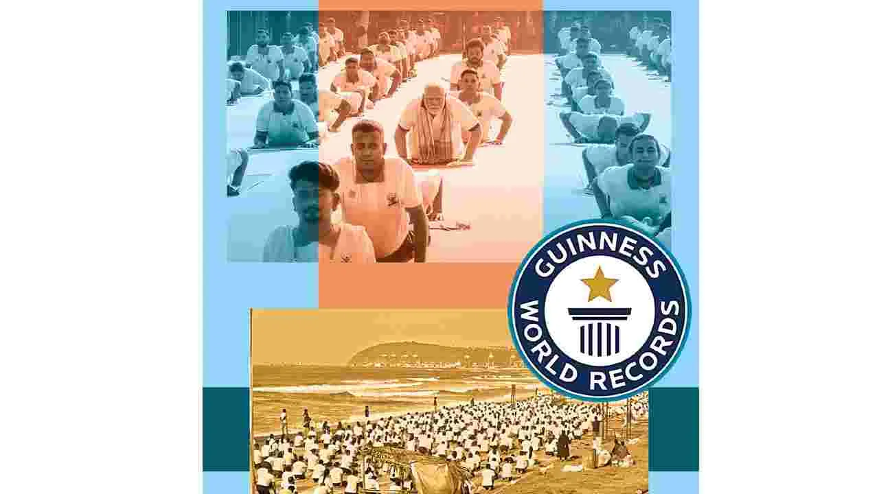 యోగా డే నాడు విశాఖ చరిత్రలో మహా అద్భుతం జరిగింది. తెల్లవారుజాము నుంచే కనుచూపుమేర ఆర్కే బీచ్ రోడ్డు యోగా అభ్యాసకులతో కిక్కిరిసిపోయింది. ఆర్కే బీచ్ నుంచి భీమిలి వరకు దాదాపు 30 కిమీ పరిధిలో ఒకే చోట 3.01 లక్షల మందితో యోగాసనాలు వేసి గిన్నిస్ వరల్డ్ రికార్డు అనే బృహత్తర యజ్ఞాన్ని నిర్విఘ్నంగా పూర్తి చేసింది కూటమి ప్రభుత్వం. దీంతో గతంలో గుజరాత్ రాష్ట్రం సూరత్లో 1.47 లక్షల మందితో నిర్వహించిన రికార్డును అధిగమించినట్టయింది. నిజానికి 30 కిమీ మేర 326 కంపార్ట్మెంట్లలో 3.19 లక్షల మంది ప్రజలు యోగాసనాలు వేసేలా అధికారులు ఏర్పాట్లు చేశారు. కానీ దూర ప్రాంతాల నుంచి వచ్చే బస్సులు ట్రాఫిక్లో చిక్కుకుపోవడంతో చాలామంది బయటే ఉండిపోవాల్సి వచ్చింది. అంతేగాక ఏయూ ఇంజనీరింగ్ మైదానం వేదికగా ఒకేచోట దాదాపు 22 వేల మందికి పైగా విద్యార్థులు సూర్య నమస్కారాలు చేసి మరో రికార్డు నెలకొల్పారు. దీంతో రెండు ప్రపంచ రికార్డులు సొంతం చేసుకుని విశాఖ కేంద్రంగా యోగాంధ్ర సరికొత్త చరిత్ర సృష్టించింది. సముద్రంలో 11 యుద్ధ నౌకలపై నేవీ సిబ్బంది ఆసనాలు వేస్తూ యోగాడేలో పాల్గొనడం, యోగా దినోత్సవానికి 175 దేశాలు మద్దతు ఇవ్వడం, యోగా ప్రపంచ దేశాలను ఏకం చేయ్యడం, ఇది సాధారణ విషయం కాదు.