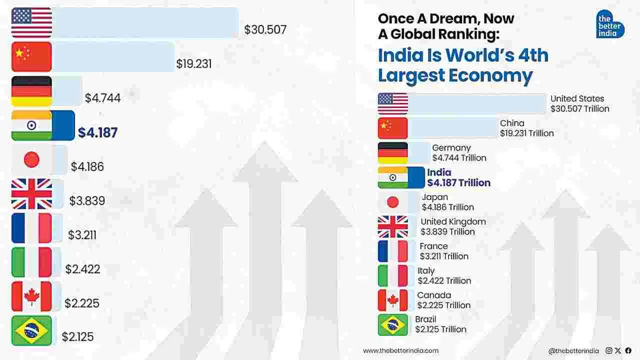 భారత్ ఐదు ట్రిలియన్ డాలర్ల లక్ష్యాన్ని ముందుకెళ్తోంది ఇప్పటికే 4.18 ట్రిలియన్ డాలర్లతో 4వ స్థానాన్ని అధిగమించి జర్మనీని వెనక్కి నెట్టేందుకు సిద్ధమవుతోంది. కానీ తలసరి ఆదాయం పరంగా భారత్కు టాప్ దేశాలతో భారీ తేడా కొనసాగుతోంది.