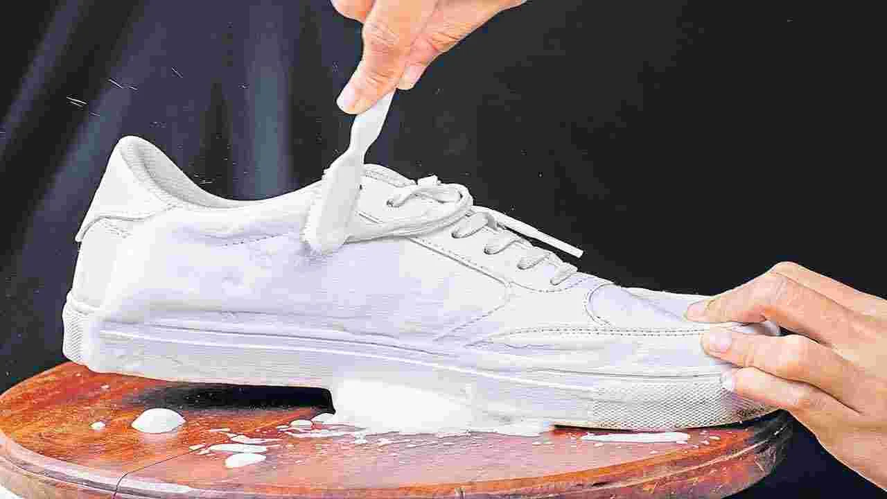 టూత్ బ్రష్ను కొద్దిగా సర్ఫ్ లేదా షాంపూలో ముంచి దానితో తెలుపు రంగు షూల పై భాగాన్ని రుద్దాలి. మురికి మొత్తం వదిలాక కొన్ని నీళ్లు చిలకరిస్తూ పలుచని గడ్డతో తుడవాలి.