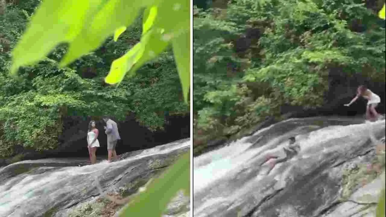 @MarchUnofficial అనే ఎక్స్ హ్యాండిల్లో ఈ వీడియో (Viral Video) షేర్ అయింది. వైరల్ అవుతున్న ఆ వీడియో ప్రకారం.. ఓ వ్యక్తి ప్రకృతి ఒడిలో తన ప్రియురాలికి లవ్ ప్రపోజ్ చేద్దామనుకున్నాడు. ఆమెను ఓ జలపాతం మధ్యలో నిలబెట్టాడు. ఆమె ముందు మోకాళ్లపై కూర్చుని ఉంగరం తీశాడు. అయితే జలపాతం చాలా వేగంగా ప్రవహిస్తుండడంతో బ్యాలెన్స్ చేసుకోలేకపోయాడు. కిందకు జారుకుంటూ వెళ్లిపోయాడు. పాపం.. ఆ అమ్మాయి డానీ.. డానీ.. అని కేకలు వేసింది. అతడు అలా జారుకుంటూ వెళ్లి కింద నీటిలో పడిపోయాడు.