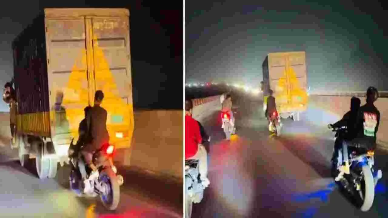 @1VaishaliMishra అనే ఎక్స్ యూజర్ ఈ వీడియోను సోషల్ మీడియాలో పోస్ట్ చేశారు. వైరల్ అవుతున్న ఆ వీడియో ప్రకారం.. బిజీగా ఉన్న రోడ్డు మీద కొందరు యువకులు బైక్లతో విన్యాసాలు చేస్తున్నారు. ఒక యువకుడు బైక్ను పలు వంకర్లు తిప్పుతూ ఓ భారీ ట్రక్కు వెనుక పోనిస్తున్నాడు. ఒక దశలో ట్రక్కు వారి బైక్ అత్యంత సమీపంగా వచ్చి ఢీకొడుతుందేమో అన్నట్టు నడిపాడు. అయితే అదృష్టవశాత్తూ అలాంటి ప్రమాదం జరగలేదు. వెనుక వస్తున్న స్నేహితులు వారి స్టంట్ను వీడియో తీసి సోషల్ మీడియాలో పోస్ట్ చేశారు (viral road stunt video).