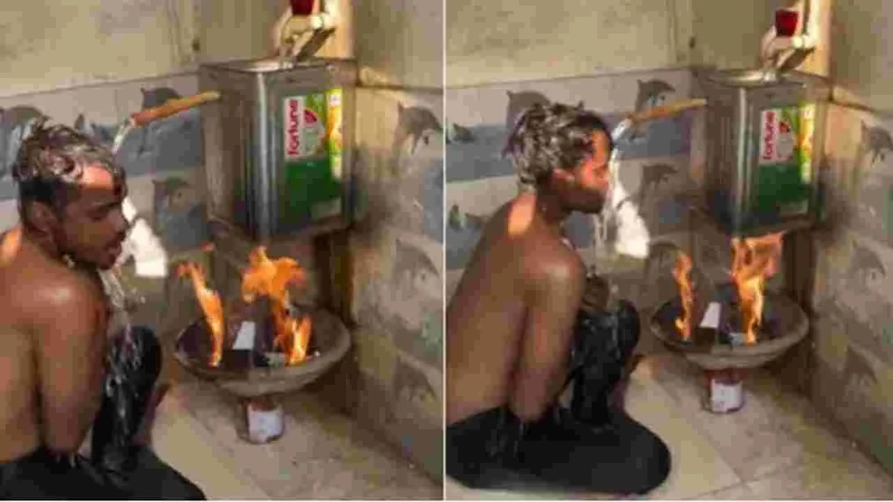 సాధారణంగా చలికాలం వస్తే అందరూ వేడి నీటితో స్నానం చేసేందుకు ఇష్టపడతారు. అయితే అందరి ఇళ్లలోనూ గీజర్లు ఉండవు. ఈ సమస్యకు చెక్ పెట్టేందుకు ఓ వ్యక్తి తన ట్యాలెంట్ను ఉపయోగించాడు. ఆ వీడియోను @DashrathDhange4 అనే ఎక్స్ యూజర్ సోషల్ మీడియాలో పోస్ట్ చేశారు. వైరల్ అవుతున్న ఆ వీడియో ప్రకారం.. ఒక వ్యక్తి బాత్రూమ్ కుళాయి కింద ఖాళీ నూనె డబ్బాను ఉంచాడు. ఆ డబ్బా కింద ఉన్న పాన్లో నిప్పు మండుతోంది. కుళాయి నుంచి నీరు డబ్బాలో పడగానే, కింద ఉన్న మంట కారణంగా ఆ నీరు వేడుక్కుతోంది (canister invention).