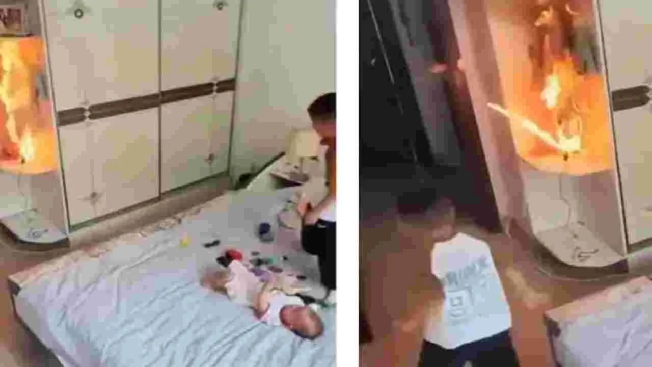 వైరల్ అవుతున్న ఆ వీడియోలో ఓ చిన్న పిల్లవాడు తన మంచం మీద పడుకుని తన చెల్లెలితో ఆడుకుంటున్నాడు. ఆ సమయంలో అకస్మాత్తుగా గదిలో మంటలు (Fire) చెలరేగాయి. మంచం పక్కన ఉన్న అల్మారాలో వేలాడుతున్న బట్టలు అకస్మాత్తుగా మంటల్లో చిక్కుకున్నాయి. ఆ మంటను చూసిన పిల్లవాడు భయపడడానికి బదులుగా చాలా తెలివిగా ప్రవర్తిస్తాడు. వెంటనే ఆ గది నుంచి బయటకు పరిగెత్తి మంటలను ఆర్పే రసాయనాన్ని తీసుకువచ్చాడు. దాన్ని స్ప్రే చేసి వెంటనే ఆ మంటలను అదుపు చేశాడు. దీంతో పెద్ద ప్రమాదం తప్పింది.