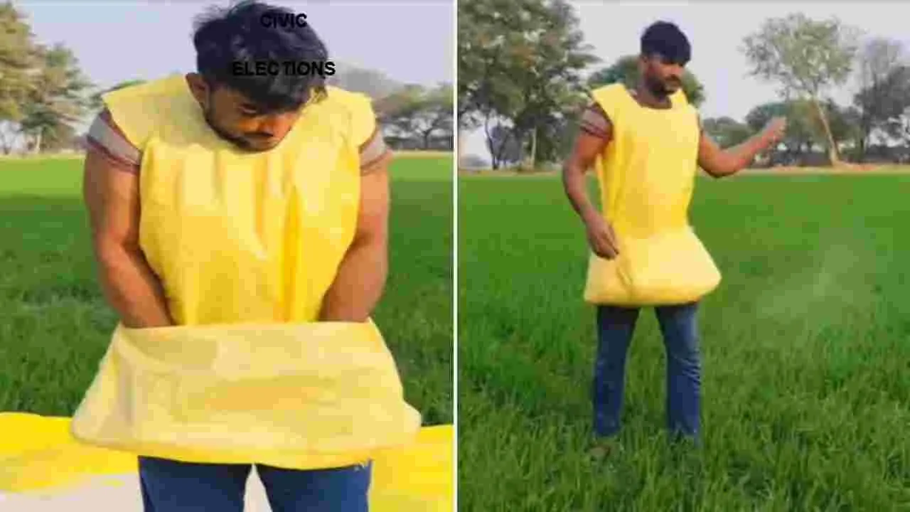 humoursgagg అనే ఇన్స్టాగ్రామ్ హ్యాండిల్లో ఈ వీడియో షేర్ అయింది. వైరల్ అవుతున్న ఆ వీడియో ప్రకారం.. ఓ కుర్రాడు పొలంలో ఎరువులు చల్లడానికి అద్భుతమైన ట్రిక్ కనిపెట్టాడు. ముందుగా ఎరువుల బస్తాను మధ్యలోకి కట్ చేశాడు. సంచి నుంచి యూరియాను బయటకు వేశాడు. ఆ సంచిని పొడవుగా మడిచి రెండు చివరలను కట్ చేశాడు. అలా కట్ చేయడంతో ఆ సంచి కాస్తా పొడవైన షర్ట్లా మారిపోయింది. ఆ షర్ట్ వేసుకుని మధ్యకు మడిచి అందులో ఎరువులు వేసుకుని సులభంగా పొలంలో చల్లుతున్నాడు (unique farming method).