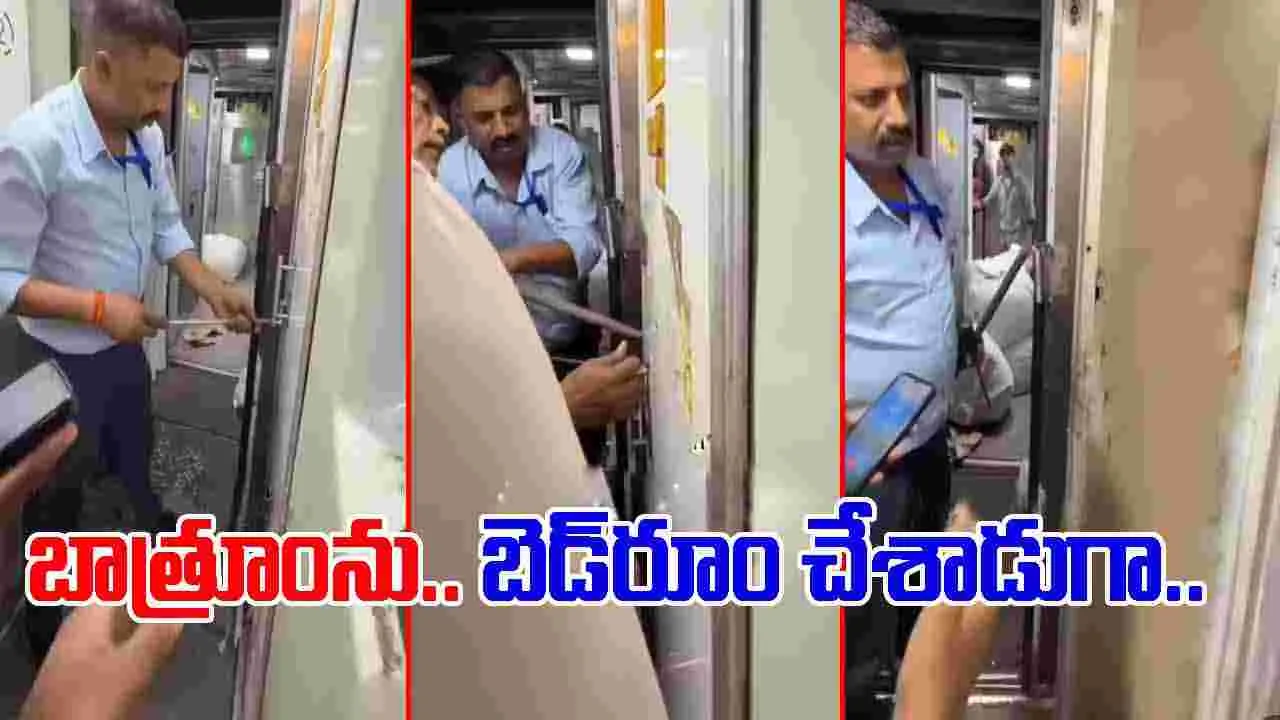 రైలుకు సంబంధించిన అనేక వీడియోలు సోషల్ మీడియాలో తెగ వైరల్ అవుతుంటాయి. రైల్లో విచిత్ర విన్యాసాలు చేయడం, రైలుపై బోగీలపై రీల్స్ చేయడం, డోరు వద్ద వేలాడుతూ స్టంట్స్ చేయడం చూస్తుంటాం. ఇలాంటి షాకింగ్ ఘటనలకు సంబంధించిన వీడియోలను నిత్యం చూస్తుంటాం. అయితే తాజాగా, రైలు బాత్రూంలో జరిగిన ఫన్నీ సంఘటనకు సంబంధించిన వీడియో నెట్టింట చక్కర్లు కొడుతోంది. ఎంతకీ బాత్రూం డోరు తెరుచుకోకపోవడంతో అనుమానం వచ్చి రైల్వే సిబ్బందికి సమాచారం అందించారు. చివరకు వారు డోరు తెరచిచూడగా.. ఫన్నీ సీన్ కనిపించింది.