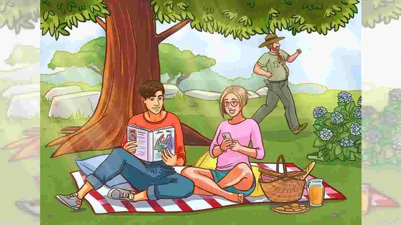 యువతి, యువకుడి పక్కనే ఓ బుట్టలో వివిధ రకాల వస్తువులు ఉంటాయి. అలాగే ఆ పక్కనే ప్లేటులో ఆహార పదార్థాలు, పక్కనే నీళ్ల మగ్ కూడా ఉంటుంది. వారి వెనుక ఓ పూల మొక్కతో పాటూ పెద్ద చెట్టు ఉంటుంది. ఆ పక్కనే టోపీ పెట్టుకున్న ఓ వ్యక్తి స్టైల్గా నడుచుకుంటూ వెళ్తున్నారు. వారికి ఇంకా దూరంగా పెద్ద పెద్ద బండరాళ్లు, చెట్లు కూడా కనిపిస్తాయి. ఇంతవరకూ అంతా బాగుంది కానీ.. ఇక్కడే మీ కంటికి పెద్ద పరీక్ష పెడుతున్నాం.