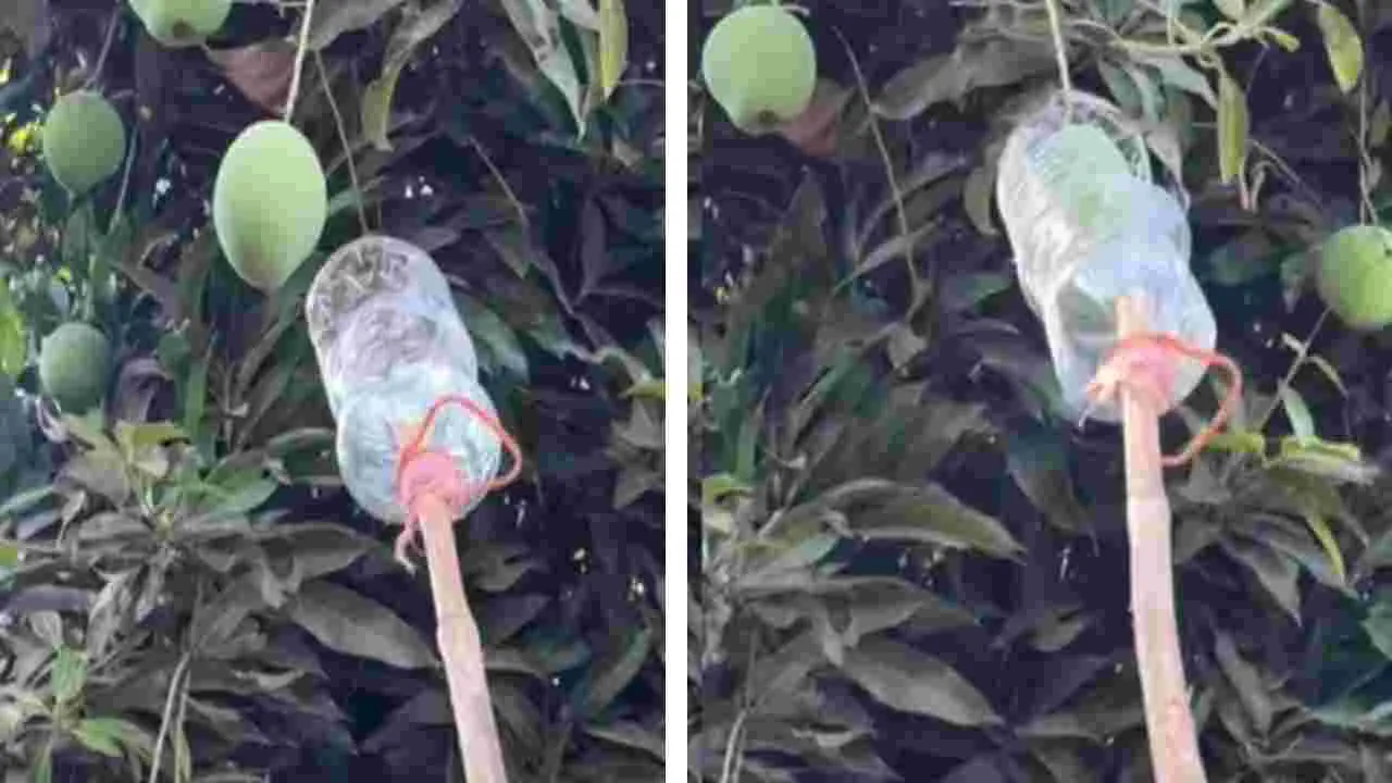 prameelafoodforever అనే ఇన్స్టాగ్రామ్ హ్యాండిల్లో ఈ వీడియో షేర్ అయింది. వైరల్ అవుతున్న ఆ వీడియో ప్రకారం ఓ వ్యక్తి ఖాళీ వాటర్ బాటిల్ను ఉపయోగించి సునాయాసంగా మామిడి కాయలను తెంపేస్తున్నాడు. సాధారణంగా చెట్టు మీద మామిడి కాయలను కర్రతో కొడితే అవి కింద పడిపోయి దెబ్బతింటాయి. అలాంటి ప్రమాదం లేకుండా ఓ వ్యక్తి ఖాళీ వాటర్ బాటిల్ను మామిడి కాయను కట్ చేసి కింద పడకుండా పట్టుకునేలా కట్ చేశాడు. ఆ సీసాను ఓ కర్రకు కట్టి దాంతో మామిడికాయలను సులభంగా కట్ చేసేస్తున్నాడు.
