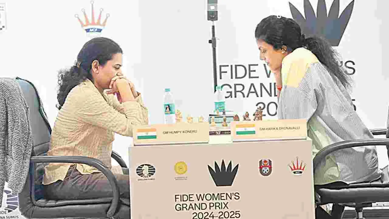 పుణె: ఇద్దరు తెలుగు గ్రాండ్మాస్టర్లు కోనేరు హంపి-ద్రోణవల్లి హారిక మధ్య అత్యంత ఆసక్తి రేపిన మహిళల గ్రాండ్ ప్రీ చెస్ ఐదో రౌండ్ గేమ్ డ్రా అయ్యింది. శుక్రవారం జరిగిన ఈ గేమ్లో హంపి-హారిక అతి జాగ్రత్తగా ఆడడంతో కేవలం 19 ఎత్తులలో ఫలితం తేలకుండా ముగిసింది. ఈ రౌండ్ అనంతరం హంపి (3.5 పాయింట్లు) తన రెండో స్థానాన్ని కొనసాగిస్తోంది. హారిక (2.5) ఐదో స్థానంలో నిలిచింది. ఝు జినెర్ (చైనా, 4) అగ్ర స్థానంలోనే నిలిచింది.