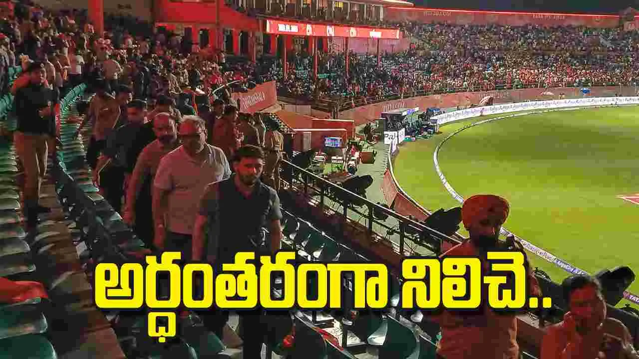 ధర్మశాల: ఐపీఎల్ చరిత్రలోనే ఎన్నడూ చూడని అరుదైన ఘటన ఇది. భారత్-పాక్ మధ్య ఉద్రిక్త పరిస్థితుల నేపథ్యంలో, పంజాబ్ కింగ్స్-ఢిల్లీ క్యాపిటల్స్ జట్ల మ్యాచ్ భద్రతా కారణాల రీత్యా మధ్యలోనే ఆగింది. గురువారం రాత్రి జమ్మూ, పఠాన్కోట్లపై పాక్ దాడులకు తెగబడింది. దీంతో ముందు జాగ్రత్తగా ధర్మశాలలో బ్లాక్అవుట్ ప్రకటించగా, ఇక్కడే జరుగుతున్న మ్యాచ్ను కూడా అర్ధంతరంగా రద్దు చేశారు. వాస్తవానికి పంజాబ్ ఇన్నింగ్స్ 10.1 ఓవర్లపాటు సజావుగానే సాగింది. ఆ తర్వాత ఒక్కసారిగా స్టేడియంలోని ఓ ఫ్లడ్లైట్ ఆఫ్ అయ్యింది. మొదట ఏదైనా సమస్య వచ్చిందేమోనని అంతా భావించారు. కానీ కాసేపటికే మరో రెండు ఫ్లడ్లైట్లను ఆపేయడంతో స్టేడియంలో చీకటి నెలకొంది. అప్పటికే ఆటగాళ్లతో పాటు అంపైర్లు కూడా మైదానం వీడారు. అలాగే స్టేడియంలోని ప్రేక్షకులను కూడా బయటికి వెళ్లాల్సిందిగా అధికారులు కోరారు. ఈ క్రమంలో ఎలాంటి తొక్కిసలాట జరగకుండా స్థానిక పోలీసులు, ఆర్మీ సిబ్బంది పర్యవేక్షించారు. మరోవైపు పటిష్ట భద్రత మధ్య ఇరు జట్ల ఆటగాళ్లను స్టేడియం నుంచి హోటళ్లకు తరలించారు.
