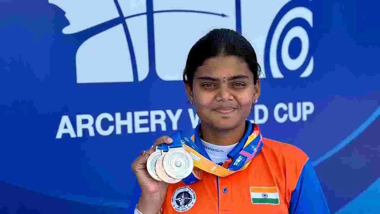 మాడ్రిడ్: కీలక తరుణంలో ఒత్తిడికి చిత్తయిన భారత స్టార్ ఆర్చర్ జ్యోతి సురేఖ త్రుటిలో రెండు స్వర్ణాలను చేజార్చుకొంది. ఆర్చరీ ప్రపంచ కప్ స్టేజ్-4 పోటీల్లో కాంపౌండ్ వ్యక్తిగత విభాగంలో రజతం సొంతం చేసుకొన్న విజయవాడ ఆర్చర్ జ్యోతి.. టీమ్ ఈవెంట్లో మరో రజతం సాధించింది. అయితే, మిక్స్డ్ కాంస్య పోరులో జ్యోతి ద్వయం విజయం సాధించింది. మొత్తంగా జ్యోతి సురేఖ ఒక్కరోజే రెండు రజతాలు, ఓ కాంస్యంతో కలిపి మూడు పతకాలు కొల్లగొట్టింది. ఆర్చరీ వరల్డ్కప్ స్టేజ్-4లో శనివారం జరిగిన కాంపౌడ్ మహిళల వ్యక్తిగత విభాగం ఫైనల్లో సురేఖ 147-148తో ఎల్లా గిబ్సన్ (బ్రిటన్) చేతిలో పరాజయం పాలై రజతంతో సరిపెట్టుకుంది. ఇక, మహిళల టీమ్ ఈవెంట్ టైటిల్పోరులో జ్యోతి, పర్ణీత్ కౌర్, ప్రీతిక ప్రదీ్పల త్రయం 225-227తో చైనీస్ తైపీ జట్టు చేతిలో ఓటమిపాలై రజతానికి పరిమితమైంది. మిక్స్డ్ కాంస్య పతక పోరులో జ్యోతి-రిషభ్ జంట 156-153తో ఎల్ సాల్వడార్కు చెందిన పౌలా-వ్లాదిమిర్ జోడీపై గెలిచింది.