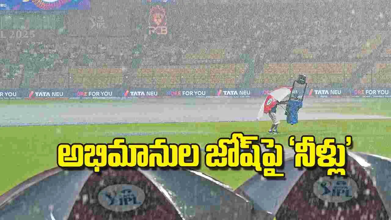 బెంగళూరు: తొమ్మిది రోజుల విరామం తర్వాత.. అభిమానుల సందడి మధ్య ఆరంభం కావాల్సిన ఐపీఎల్కు వరుణుడు షాకిచ్చాడు. శనివారం సాయంత్రం నుంచి ఏకధాటిగా వర్షం కురవడంతో రాయల్ చాలెంజర్స్ బెంగళూరు-కోల్కతా నైట్రైడర్స్ జట్ల మధ్య ఇక్కడ జరగాల్సిన కీలక మ్యాచ్ రద్దయ్యింది. దీంతో ఇరు జట్లకు చెరో పాయింట్ను కేటాయించారు. ఫలితంగా 13 మ్యాచ్లాడి 12 పాయింట్లతో ఉన్న డిఫెండింగ్ చాంపియన్ కోల్కతా ప్లేఆఫ్స్ రేసు నుంచి నిష్క్రమించింది. అటు బెంగళూరు 17 పాయింట్లతో పట్టికలో టాప్నకు చేరింది. ఈ మ్యాచ్లో నెగ్గితే రజత్ పటీదార్ సారథ్యంలోని బెంగళూరు నేరుగా ప్లేఆ్ఫ్సకు వెళ్లేది. అంతకుముందు సాయంత్రం ఆరు గంటల నుంచే భారీ వర్షం ఆరంభమైంది. దీంతో టాస్ కూడా వీలు పడలేదు. అయితే స్థానిక చిన్నస్వామి స్టేడియంలో అత్యాధునిక డ్రైనేజి సిస్టం ఉండడంతో మ్యాచ్పై ఆశలు పెట్టుకున్నారు. కాసేపు వర్షం ఆగడంతో మ్యాచ్ నిర్వహణకు వీలుగా మైదానం సిబ్బంది రంగంలోకి దిగారు. కాసేపటికే తిరిగి వాన పుంజుకోవడంతో చేసేదేమీ లేకపోయింది. చివరకు రాత్రి 10.23కి మ్యాచ్ను రద్దు చేస్తున్నట్టు అంపైర్లు ప్రకటించారు.