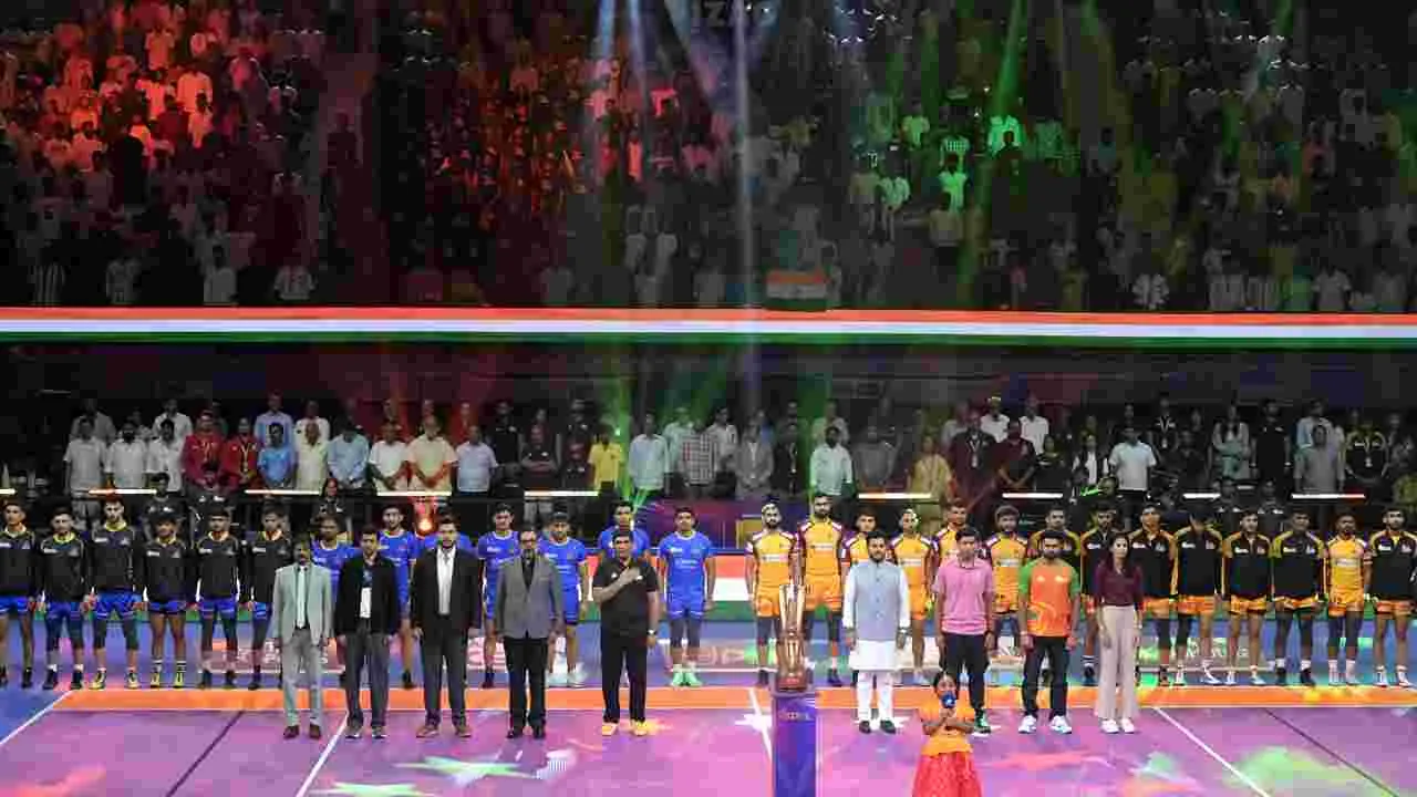 విశాఖపట్నం స్పోర్ట్స్ (ఆంధ్రజ్యోతి): సొంతగడ్డపై జరుగుతున్న ప్రొ కబడ్డీ లీగ్ (పీకేఎల్)ను విజయంతో ప్రారంభించాలనుకున్న తెలుగు టైటాన్స్కు నిరాశే ఎదురైంది. ఇక్కడి రాజీవ్గాంధీ ఇండోర్ స్టేడియంలో శుక్రవారం మొదలైన లీగ్లో టైటాన్స్ జట్టుకు తమిళ్ తలైవాస్ ఝలకిచ్చింది. హోరాహోరీగా సాగిన తొలి మ్యాచ్లో తలైవాస్ 38-35 స్కోరుతో తెలుగు టైటాన్స్పై విజయం సాధించింది. స్టార్ రైడర్ అర్జున్ దేశ్వాల్ సూపర్ 10, కెప్టెన్ పవన్ సెహ్రావత్ 9 పాయింట్లు స్కోరు చేసి తలైవాస్ జట్టు విజయంలో కీలకపాత్ర పోషించారు. ఇక, ఆతిథ్య టైటాన్స్ జట్టు తరఫున భరత్ హుడా తొమ్మిది పాయింట్లతో రాణించాడు. అనంతరం పుణెరి పల్టన్, బెంగళూరు బుల్స్ జట్ల మధ్య జరిగిన రెండో మ్యాచ్లో తొలుత 32-32తో స్కోర్లు సమమయ్యాయి. దీంతో ఫలితం కోసం నిర్వహించిన టైబ్రేకర్లో పుణెరి జట్టు 6-4తో విజయం సాధించింది. అంతకుముందు.. కేంద్ర మంత్రి రామ్మోహన్ నాయుడు ప్రత్యేక అతిథిగా హాజరై లీగ్ను ప్రారంభించారు. ఆరంభ వేడుకల్లో హాకీ మాజీ కెప్టెన్ ధన్రాజ్ పిళ్లే, బ్యాడ్మింటన్ కోచ్ పుల్లెల గోపీచంద్, యువ క్రికెటర్ వైభవ్ సూర్యవంశీ, అంతర్జాతీయ అథ్లెట్ యర్రాజీ జ్యోతి, కబడ్డీ దిగ్గజం పర్దీప్ నర్వాల్, పారాలింపిక్స్ పతక విజేత యోగేష్ కథూనియా పాల్గొన్నారు.