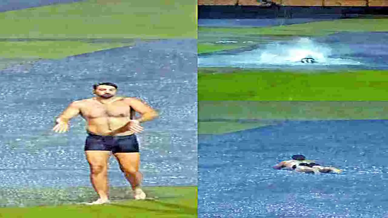 బెంగళూరులో వర్షం కారణంగా స్టేడియం పూర్తిగా తడిసి ముద్దైంది. ఆర్సీబీ ఆటగాడు టిమ్ డేవిడ్ వర్షపు నీటిలో ఈత ఆడి ఆనందాన్ని వ్యక్తపరిచాడు.