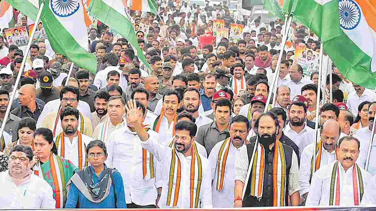 బాచుపల్లిలో వీఎన్ఆర్ ఇంజినీరింగ్ కళాశాల నుంచి కేజీఆర్ కన్వెన్షన్ వరకూ సాగిన ర్యాలీలో సీఎంతోపాటు మంత్రులు ఉత్తమ్ కుమార్ రెడ్డి, శ్రీధర్బాబు, పొన్నం ప్రభాకర్, ఏఐసీసీ రాష్ట్ర ఇన్చార్జ్ మీనాక్షి నటరాజన్, పీసీసీ అధ్యక్షుడు మహేశ్కుమార్ గౌడ్, ఎమ్మెల్సీ విజయశాంతి తదితరులు పాల్గొన్నారు. ర్యాలీ అనంతరం నిర్వహించిన సభలో సీఎం రేవంత్ మాట్లాడారు. ‘‘దేశభద్రతకు సంబంధించిన అంశాల్లో రాజకీయాలకతీతంగా మనమంతా కలిసి ఉండాలి. ఎన్నికలు వచ్చినప్పుడే రాజకీయాలు అని కాంగ్రెస్ అగ్రనేతలు సోనియా, రాహుల్ గాంధీ, ఖర్గే మాకు ఉద్బోధించారు. దేశం మీద, పౌరుల మీద దాడి చేసినప్పుడు ప్రధానికి అండగా నిలబడి.. ‘యుద్ధం చేయండి, మీ నిర్ణయాలను సమర్థిస్తామ’ని ఆనాడు అఖిలపక్షంలో కాంగ్రెస్ పార్టీ స్పష్టంగా చెప్పింది. నాలుగు రోజుల తర్వాత ఎవరికి ఎవరు లొంగిపోయారో తెలియదు కానీ అర్ధాంతరంగా అమెరికా ప్రెసిడెంట్ ట్రంప్ బయటికి వచ్చి ‘యుద్ధాన్ని ఆపేసినా.. భారత్ను బెదిరించినా’ అనే పరిస్థితి వచ్చింది’’ అని సీఎం ధ్వజమెత్తారు. పాకిస్థాన్ మనపై దాడి చేసినప్పుడు యుద్ధం చేయడానికి అఖిలపక్షంతో చర్చించిన మోదీ.. యుద్ధం ఆపాలనుకున్నప్పుడు ఎందుకు అఖిలపక్ష భేటీ నిర్వహించలేదని నిలదీశారు. ‘‘ఇది నీ సొంత వ్యవహారం కాదు.. మీ పార్టీ వ్యవహారం కాదు. దేశ భద్రతకు సంబంధించిన విధానం. యుద్ధం విరమించడం ద్వారా 140కోట్ల భారతీయుల ఆత్మ గౌరవాన్ని ట్రంప్ దగ్గర తాకట్టు పెట్టి, గొప్పల కోసం బీజేపీ వాళ్లు ఉపన్యాసాలిస్తున్నారు’’ అని విమర్శించారు. దేశ భద్రత విషయంలో రాజకీయాలకు తావులేదన్నారు. భారత సైన్యం విజయవంతంగా ఆపరేషన్ సిందూర్ నిర్వహించిందని, రాజకీయాలకు అతీతంగా తాము మద్దతిచ్చామని సీఎం గుర్తుచేశారు.