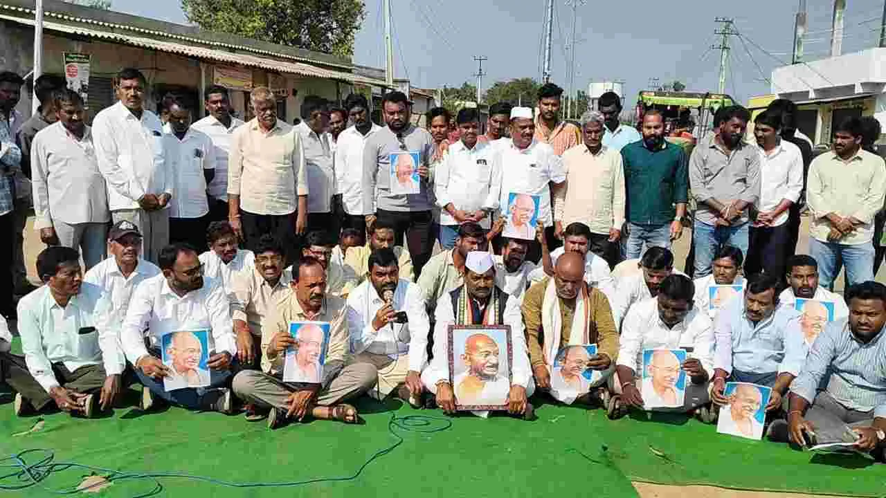 కోటపల్లి, డిసెంబరు 28 (ఆంధ్రజ్యోతి) : మహాత్మాగాంధీ జాతీయ గ్రామీ ణ ఉపాధి హామీ పథకంలో గాంధీ ఫొటోను తొలగించేందుకు బీజేపీ కుట్ర పన్నుతుందని ఆదివారం మండల కేంద్రంలో కాంగ్రెస్ పీసీసీ జిల్లా అధ్యక్షు డు రఘునాధ్రెడ్డి ఆధ్వర్యంలో నాయకులు నిరసన వ్యక్తం చేశారు. ప్రధాన రహదారిపై బైఠాయించి గాంధీ ఫొటో చేత పట్టి కేంద్ర ప్రభుత్వానికి వ్యతిరే కంగా నినాదాలు చేశారు. గాంధీ ఫొటోను తొలగిస్తే ఉద్యమిస్తామని హెచ్చ రించారు. ఈ కార్యక్రమంలో పార్టీ జిల్లా అధికార ప్రతినిధి ఒడ్నాల శ్రీనివాస్, సర్పంచు ఆలూరి సంపత్, నాయకులు రాజమల్లగౌడ్, బైస ప్రభాకర్, దుర్గం వెంకటస్వామి తదితరులు పాల్గొన్నారు.