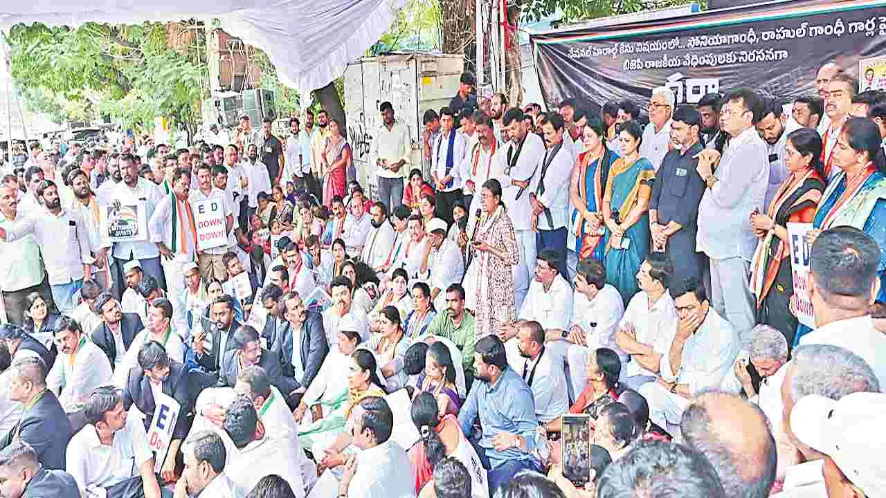 డిప్యూటీ సీఎం మల్లు భట్టివిక్రమార్క మాట్లాడుతూ.. దేశంలో కులగణనను అడ్డుకోవడానికే సోనియా, రాహుల్పై అక్రమ కేసులు బనాయిస్తున్నారని ఆరోపించారు. తమ వైఫల్యాల నుంచి ప్రజల దృష్టి మరల్చేందుకే బీజేపీ కక్షపూరిత రాజకీయాలకు పాల్పడుతోందని మంత్రి శ్రీధర్బాబు అన్నారు. మంత్రి జూపల్లి కృష్ణారావు మాట్లాడుతూ.. మోదీ ప్రభుత్వం విపక్ష నేతలను లక్ష్యంగా చేసుకుని ఈడీ వంటి సంస్థలను దుర్వినియోగం చేస్తున్నదని ధ్వజమెత్తారు. మోదీ, అమిత్షాల డైరెక్షన్లోనే సోనియా, రాహుల్ఫై ఈడీ చార్జిషీటు దాఖలు చేసిందని మంత్రి దామోదర రాజనర్సింహ ఆరోపించారు. మంత్రి పొన్నం ప్రభాకర్ మాట్లాడుతూ.. మోదీ దేశ సంపదను అదానీ, అంబానీలకు అప్పగిస్తున్నారని, దానిని వ్యతిరేకిస్తే కక్షసాధింపు చర్యలకు పాల్పడుతున్నారని ఆరోపించారు. రాజకీయ కక్ష సాధింపు చర్యల్లో భాగంగానే రాహుల్, సోనియాలపై అక్రమ కేసులు బనాయించారని మహేష్ కుమార్ గౌడ్ ఆరోపించారు. కార్యక్రమంలో ఏఐసీసీ కార్యదర్శి విశ్వనాథం, మంత్రి తుమ్మల, ఎంపీ అనిల్కుమార్యాదవ్, మాజీ ఎంపీలు వి.హనుమంతరావు, ఎం.అంజన్కుమార్ యాదవ్, ఎమ్మెల్యేలు శంకరయ్య, రాజ్ఠాకూర్, ఎమ్మెల్సీ బల్మూర్ వెంకట్, అద్దంకి దయాకర్, కార్పొరేషన్ల చైర్మన్లు పాల్గొన్నారు.