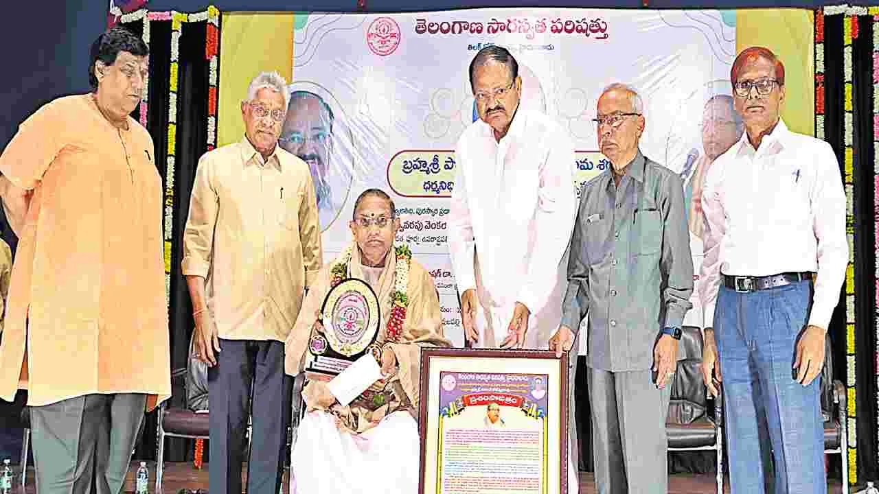 హైదరాబాద్ సిటీ, అక్టోబరు23(ఆంధ్రజ్యోతి): గూగుల్ వచ్చినా సమస్య వస్తే మాత్రం గురువు దగ్గరకే వెళ్లాలని మాజీ ఉపరాష్ట్రపతి ముప్పవరపు వెంకయ్యనాయుడు చమత్కరించారు. ధారాళంగా మాట్లాడే నేర్పు తన గురువు బ్రహ్మశ్రీ పోలూరి హనుమజ్జానకీ రామశర్మ ఽప్రేరణతోనే తనకు వచ్చిందన్నారు. బొగ్గులకుంటలోని తెలంగాణ సారస్వత పరిషత్తు హాల్లో జరిగిన కార్యక్రమంలో పోలూరి హనుమజ్జానకీ రామశర్మ ధర్మనిధి సాహిత్య పురస్కారాన్ని ఆంధ్రప్రదేశ్ ప్రభుత్వ సలహాదారుడు చాగంటి కోటేశ్వరరావుకు వెంకయ్య అందజేశారు. శాలువా, జ్ఞాపికతో పాటు ప్రశంసాపత్రంతో సత్కరించి రూ.25,000 నగదు పురస్కారాన్ని అందించారు. ఆధ్యాత్మిక ప్రవచనాలు పెద్దవారికి మాత్రమే అనుకునే భ్రమను తొలగించి యువతరాన్ని కూడా ఆకట్టుకున్నారని చాగంటిని ప్రశంసించారు. తెలంగాణ సారస్వత పరిషత్తుకు వెంకయ్య నాయుడు ఇచ్చిన రూ.5 లక్షల విరాళంతో ఆయన గురువు హనుమజ్జానకీరామశర్మ పేరుమీద ప్రతి ఏటా ఒకరికి పురస్కారం ప్రదానం చేస్తున్నట్లు పరిషత్తు ప్రధాన కార్యదర్శి జే.చెన్నయ్య చెప్పారు. కార్యక్రమంలో పాల్గొన్న శాంతా-వసంతా ట్రస్టు వ్యవస్థాపకుడు కేఐ వరప్రసాదరెడ్డి, సాహితీవేత్త రేపూరి అనంతపద్మనాభరావు కూడా పోలూరి శిష్యులే అని సభాధ్యక్షత వహించిన తెలంగాణ ప్రభుత్వ మాజీ సలహాదారుడు కేవీ రమణాచారి చెప్పారు. పురస్కార గ్రహీత చాగంటి మాట్లాడుతూ సనాతన ధర్మంలో గురువు మాటకు విశిష్టమైన స్థానం ఉందని అన్నారు.