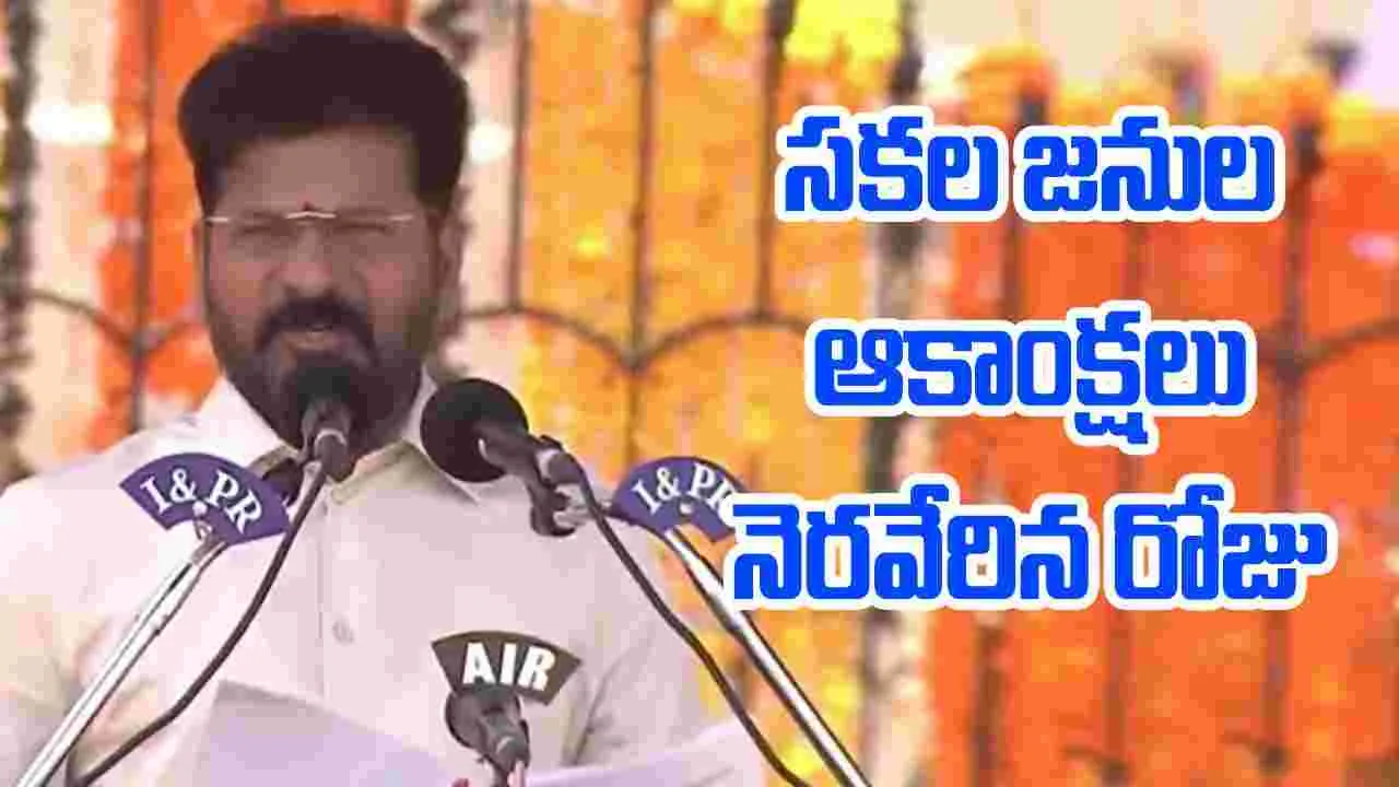 సకల జనుల ఆకాంక్షలు నెరవేరిన రోజు అని మఖ్యమంత్రి రేవంత్రెడ్డి అభివర్ణించారు. మహిళలను పారిశ్రామికవేత్తలుగా తీర్చిదిద్దటమే తమ ప్రభుత్వం లక్ష్యమని వ్యాఖ్యానించారు. తెలంగాణ రాష్ట్రాన్ని పునర్నిర్మించే దిశగా అడుగులు వేస్తున్నామని తెలిపారు. రాష్ట్రం వచ్చి పదేళ్లయినా ఆకాంక్షలు నెరవేరలేదని ఆవేదన వ్యక్తం చేశారు. పదేళ్ల ఆధిపత్యాన్ని తిరస్కరించి.. ప్రజా ప్రభుత్వాన్ని తెచ్చుకున్నారని మఖ్యమంత్రి రేవంత్రెడ్డి పేర్కొన్నారు.