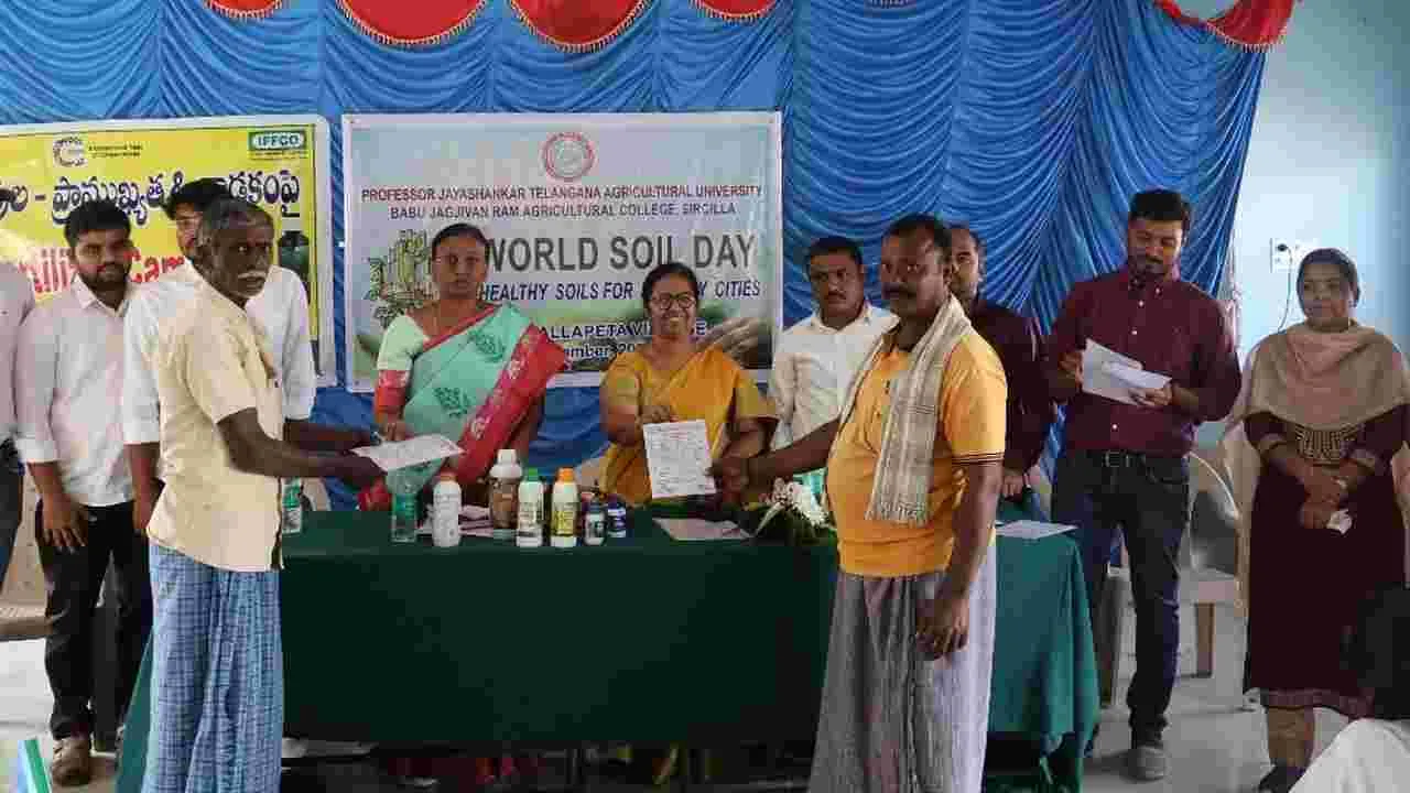 తంగళ్లపల్లి, డిసెంబరు 5 (ఆంధ్రజ్యోతి): నేల ఆరోగ్య పరిర క్షణలో ప్రతి రైతు జాగ్రత్తలు తీసుకోవాలని జిల్లా వ్యవసాయ శాఖాధికారి అప్జల్ బేగమ్ సూచించారు. వ్యవసాయ కళాశాల దత్తత గ్రామం తంగళ్లపల్లి మండలం రాళ్లపేటలో ప్రపంచ మృత్తికా దినోత్సవం(హెల్త్సాయిల్ ఫర్ హేల్తీ సిటిస్) నిర్వ హించారు. ఈ కార్యక్రమానికి ముఖ్యఅథితిగా హాజరైన వ్యవ సాయ శాఖాధికారి మాట్లాడుతూ పట్టణీకరణ పెరుగుతున్న నేపథ్యంలో ఆరోగ్య కరమైన నేలలు- ఆరోగ్యకరమైన పట్టణాల నిర్మాణానికి పునాది అన్నారు. వ్యవసాయ కళాశాల డీన్ సునీతదేవి మాట్లాడుతూ అర్బన్ ఫార్మింగ్, నేల ఆరోగ్యం ప్రాముఖ్యత గూర్చి వివరించారు. ఈ సందర్బంగా డాక్టర్ సాయికుమార్, డాక్టర్ సంపత్కుమార్, డాక్టర్ అరుణ్ బాబు, ఇఫ్కో మేనేజర్ నరేష్లు నేల పరిరక్షణ, ఆధునిక పద్ధతుల వ్యవసాయం తదితర అంశాలను వివ రించారు. అనంతరం రైతులకు నేల భూసార పరీక్ష పత్రాలను ఆందజే శారు. విద్యార్దులు నిర్వహించిన వర్మీకంపోష్టు, నేలలకు సంబంధించిన ఎగ్జిబిషన్ను తిలకించారు. ఈ కార్యక్రమంలో ఎంఏవో సంజీవ్, సాయి కిరణ్, ఏఈవో అనుష, విద్యార్థులు, రైతులు పాల్గొన్నారు.
