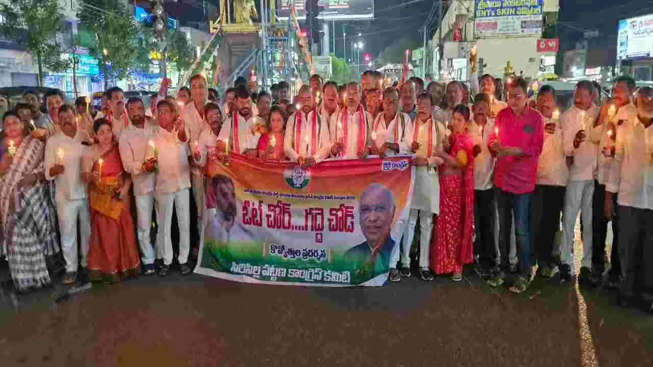 సిరిసిల్ల టౌన్, ఆగస్టు 14 (ఆంధ్రజ్యోతి) : ఎన్నికల కమిషన్ బీజేపీతో చేతులు కలపడం వల్లనే దొంగ ఓట్లు సాధ్యమైందని ప్రభుత్వ విప్ ఆది శ్రీనివాస్ అన్నారు. గురువారం జిల్లా కాంగ్రెస్ పార్టీ ఆధ్వర్యంలో జిల్లా కేంద్రంలోని నేతన్న విగ్రహం నుంచి గాంధీచౌక్ వరకు ఓటు చోర్ గద్దె చోడ్ అనే నినాదంతో కొవ్వొ త్తుల ర్యాలీతో నిరసనలు తెలిపారు. ఈసందర్భంగా ప్రభుత్వ విప్ ఆది శ్రీనివాస్ మాట్లాడారు. ప్రధాన మంత్రి నరేంద్రమోది నాయ కత్వంలో బీజేపీ ప్రభుత్వం ఓట్లను దొంగలిస్తూ గెలుస్తున్న వైనా న్ని సోనియాగాంఽధీ నాయకత్వంలో లోక్సభ ప్రతిపక్ష నేత రాహు ల్గాంధీ, ఏఐసీసీ అధ్యక్షుడు ఖార్గే ప్రజా పోరాటాలు చేస్తూ ముం దుకు వెల్తున్నారని అన్నారు. దేశవ్యాప్తంగా ప్రజలకు ఓట్ల చోరీపై ఒక సినిమాల వీడియో రూపంలో చూపిస్తుంటే బీజేపీ ఈ రూప కంగా దొంగ ఓట్లతో గెలుస్తుందన్న భావన ప్రజలో వచ్చిందన్నారు. పార్లమెంట్లో ప్రశ్నించే పెద్దల గొంతుకలను నొక్కుతూ ఎంపీలను అరెస్టు చేస్తూ జైలుకు పంపే ప్రయత్నాని తప్పుపడుతూ ఏఐసీసీ అధ్యక్షుడు ఖార్గే, టీపీసీసీ మహేష్కుమార్గౌడ్ ఆదేశాల మేరకు కొవ్వొత్తుల ర్యాలీలతో నిరసనలు తెలిపామన్నారు. ఈ కార్యక్రమంలో గ్రంథాలయం జిల్లా చైర్మన్ నాగుల సత్యనారాయణ, మార్కెట్ కమి టీ చైర్పర్సన్ వెల్ముల స్వరూపతిరుపతిరెడ్డి, పట్టణ కాంగ్రెస్ అధ్యక్షు డు చొప్పదండి ప్రకాష్, ప్రధానకార్యదర్శి మ్యాన ప్రసాద్, ఉపాధ్య క్షుడు బొప్ప దేవయ్య, బ్లాక్ కాంగ్రెస్ అధ్యక్షుడు సూర దేవరాజు, ఎస్సీ సెల్ జిల్లా అధ్యక్షుడు అకునూరి బాలరాజు, కాంగ్రెస్ మహిళ విభాగం జిల్లా అధ్యక్షురాలు కాముని వనిత, టీపీసీసీ కో ఆర్డెనేటర్ సంగీతం శ్రీనివాస్, పార్లమెంట్ కో ఆర్డనేటర్ కనమేని చక్రధర్రెడ్డి, మహిళ జిల్లా అధ్యక్షురాలు కాముని వనిత పీసీసీ మాజీ కార్యదర్శి గడ్డం నర్సయ్య తదితరులు పాల్గొన్నారు.