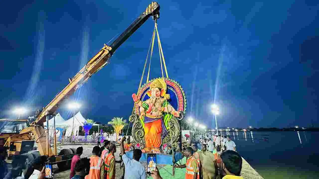 వేములవాడ కల్చరల్, సెప్టెంబరు 4 (ఆంధ్రజ్యోతి): వేములవాడ పట్టణంలో గురువారం రాజన్న ఆలయ గుడి చెరువులో మున్సిపల్ ఆధ్వర్యంలో నిమజ్జన వేడుకలను ఘనంగా నిర్వహించారు. మున్సిపల్ ఆధ్వర్యంలో 5 భారీ క్రేన్లను, పదిమంది గజ ఈతగాళ్లతో పాటు గుడి చెరువులో బోట్ సౌకర్యాన్ని కల్పించారు. గుడి చెరువులో ఏర్పాటు చేసిన సాంస్కృతిక కార్యక్రమాలను, గణేష్ నిమజ్జనోత్సవాలను చూసేందుకు పట్టణ ప్రజలు, భక్తులు తరలివచ్చారు. నిమజ్జనోత్సవాలకు ప్రభుత్వ విప్ ఆది శ్రీనివాస్ ముఖ్యఅతిథిగా హాజరయ్యారు. గుడి చెరువులో ఏర్పాట్లను పరిశీలించారు. అంతకు ముందు రాజన్న ఆలయంలో ప్రతిష్టించిన వినాయకుడి వద్ద ప్రత్యేక పూజలో పాల్గొన్నారు. పట్టణంలోని పలు వినాయక మండపాల వద్దకు వెళ్లి ప్రత్యేక పూజలో పాల్గొని డప్పుకళాకారులతో నృత్యం చేస్తూ రాజన్న ఆలయం ముందు ఒగ్గుడోలు కొడుతూ శోభాయాత్రలో సందడి చేశారు.