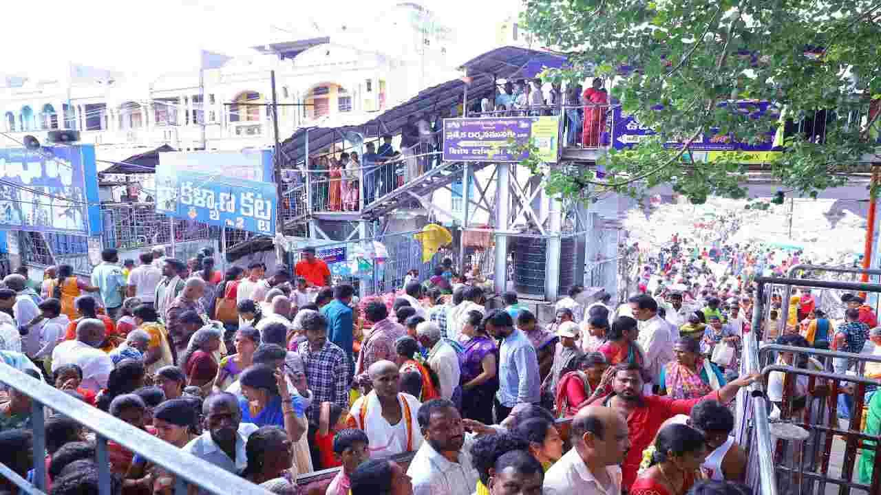 వేములవాడ కల్చరల్, ఆగస్టు 11 (ఆంధ్రజ్యోతి): హర హర మహాదేవా.. శంభో శంకరా.. అంటూ భక్తులు చేసిన నినాదాలతో ఆలయ పరిసరాలు మార్మోగాయి. శ్రావణ సోమవారం సందర్భంగా రెండు తెలుగు రాష్ట్రాలతో పాటు ఇతర రాష్ట్రాల నుంచి 50 వేలకు పైగా భక్తులు ఆలయానికి తరలివచ్చారు. దీంతో ఆలయ పరిసరాలు భక్తులతో కిక్కిరిసిపోయాయి. సోమవారం తెల్లవారుజామునే భక్తులు రాజన్న ఆలయ ధర్మగుండంలో పవిత్రస్నానాలు ఆచరించారు. భక్తులు శివసత్తుల పూనకాలతో ఊగిపోయారు. కల్యాణకట్టలో తలనీలాలు సమర్పించుకున్నారు. రాజన్నకు ఎంతో ప్రీతిపాత్రమైన కోడెమొక్కు చెల్లించుకునేందుకు క్యూలైన్లో నాలుగు గంటలపాటు నిరీక్షించినట్లు భక్తులు తెలిపారు. ధర్మదర్శనం, శీఘ్రదర్శనం, బ్రేక్దర్శనం క్యూలైన్ల ద్వారా భక్తులు ఆలయంలోకి చేరుకున్నారు. ముందుగా లక్ష్మీగణపతిని, ఆలయంలోకి ప్రవేశించి రాజరాజేశ్వర స్వామిని దర్శించుకున్నారు. శ్రావణ మాసం మూడో సోమవారం సందర్భంగా భక్తులు రాజరాజేశ్వరీదేవి అమ్మవారికి నూతన వస్ర్తాలతో ఒడిబియ్యం సమర్పించి మొక్కులు చెల్లించుకున్నారు. పరివారం దేవతాలయాలైన సీతరామచంద్ర స్వామి, అనంతపధ్మనాభ స్వామి, బాలత్రిపురసుందరీ దేవి, బాలరాజరాజేశ్వరస్వామి, శ్రీవల్లిసుబ్రహ్మణ్యస్వామి, దక్షణమూర్తిస్వామిని దర్శించుకున్న భక్తులు కుంకుమ పూజలో పాల్గొన్నారు. ఆలయం ముందు రావిచెట్టు కిందకు చేరుకుని దీపాలు వెలిగించి మొక్కులు చెల్లించుకున్నారు. భక్తులకు ఇబ్బందులు తలెత్తకుండా ఆలయ ఈవో రాధాబాయి ఆధ్వర్యంలో ఏఈవోలు బ్రహ్మన్నగారి శ్రీనివాస్, శ్రావణ్కుమార్, అశోక్కుమార్తో పాటుగా ఉద్యోగులు నరేందర్, శ్రీనివాస్చారి, రాజేందర్లు ఏర్పాట్లను పర్యవేక్షిస్తూ క్యూలైన్లు త్వరగా కదిలేలా చర్యలు తీసుకున్నారు.