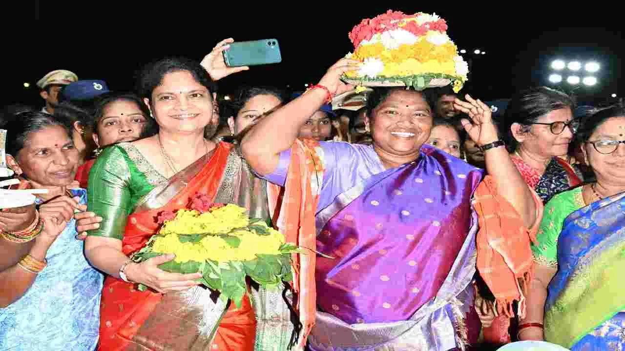 కరీంనగర్ కల్చరల్, సెప్టెంబరు 24 (ఆంధ్రజ్యోతి): సృష్టి ఉన్నంత కాలం మన సంస్కృతి బతికి ఉంటుందని రాష్ట్ర మహిళా శిశు సంక్షేమ శాఖ మంత్రి సీతక్క అన్నారు. బుధవారం కరీంనగర్ ఫూలే మైదానంలో మున్సిపల్ కార్పొరేషన్, మహిళలు, పిల్లలు, దివ్యాంగులు, వయోవృద్ధుల శాఖ ఆధ్వర్యంలో ఏర్పాటు చేసిన జిల్లా స్థాయి బతుకమ్మ సంబరాలకు ఆమె ముఖ్య అతిథిగా హాజరై మాట్లాడారు. మహిళలు ఆర్థికంగా, రాజకీయంగా ఎదగాలనేదే సీఎం రేవంత్ లక్ష్యమన్నారు. కోటి మంది మహిళలను కోటీశ్వరులుగా చేయాలనే సంకల్పంతో సీఎం ముందుకు పోతున్నారన్నారు. ఆడబిడ్డలు సుఖ సంతోషాలతో ఆనందంగా ఉండాలని అమ్మవారిని వేడుకుంటున్నానని తెలిపారు. 39 మంది ట్రాన్స్ జెండర్లకు ట్రాఫిక్ సహాయకులుగా సీఎం ఉపాధి కల్పించారని, వారికి మరిన్ని ఉద్యోగావకాశాలు కల్పిస్తామని చెప్పారు.