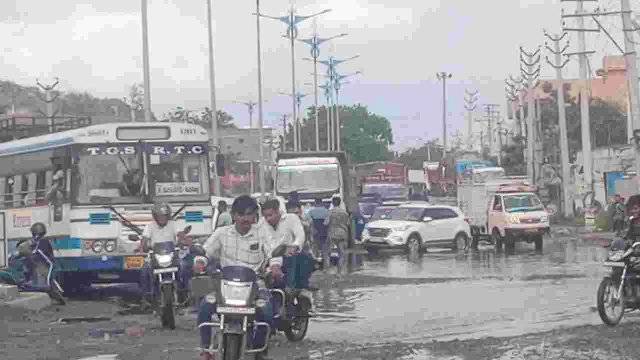 రోడ్డుపై గుంతలు పడి, నీరు చేరడంతో ఇబ్బందులు పడుతున్న వాహనదారులు