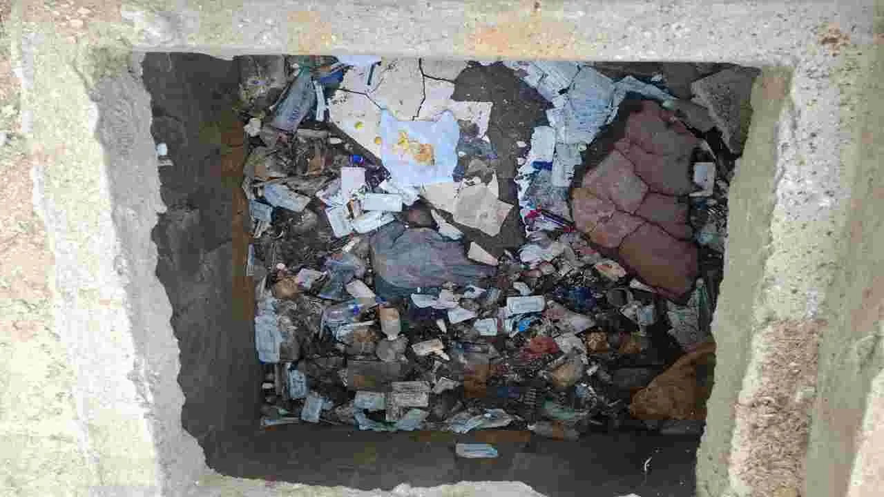 సెప్టిక్ ట్యాంక్లో గర్భనిర్ధారణ కిట్లు, ఆంపిల్స్, సిరంజిలు