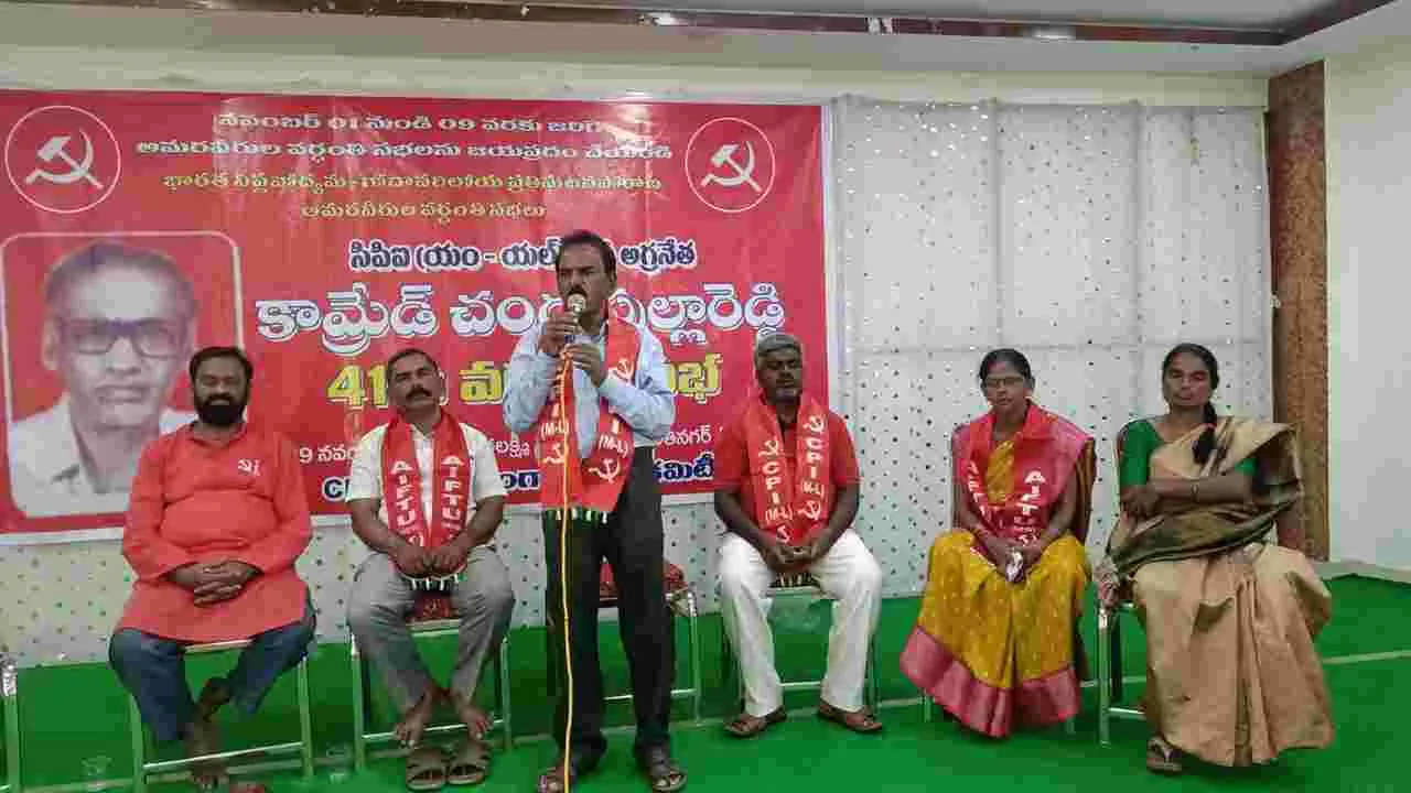 సిరిసిల్ల టౌన్, నవంబరు 9 (ఆంధ్రజ్యోతి) : ప్రజా పోరాటాలు చేసి న ప్రజా పోరాటయోధులను ఆదర్శంగా తీసుకొని విప్లవోద్యమంలో ఎర్రజెండా నీడలోకి అందరూ కలసిరావాలని సీపీఐ(ఎంఎల్) రాష్ట్ర కార్యదర్శి ప్రసాద్ అన్నారు. ఆదివారం జిల్లా కేంద్రంలో ఏఐఎఫ్టీయూ (న్యూ) ఆధ్వర్యంలో చండ్ర పుల్లారెడ్డి వర్ధంతిని ఘనంగా నిర్వహిం చారు. ముందుగా జిల్లా కేంద్రం శాంతినగర్ చౌరస్తాలో సీపీఐ(ఎం ఎల్) రాష్ట్ర కార్యదర్శి ప్రసాద్ జెండాను ఆవిష్కరించారు. అనంతరం శాంతినగర్ చౌరస్తా నుంచి వరలక్ష్మి ఫంక్షన్ హాల్ వరకు కళాకారులు ఆటపాటల మధ్య ర్యాలీ నిర్వహించి అలరించారు. వరలక్ష్మి ఫంక్షన్ హాల్లో ఏఐఎఫ్టీయూ(న్యూ) రాష్ట్ర కార్యవర్గ సభ్యుడు సోమిశెట్టి దశరథం అధ్యక్షతన చండ్ర పుల్లారెడ్డి వర్ధంతి సభ జరిగింది. ఈ సంద ర్భంగా ముఖ్య అతిథి ప్రసాద్ మాట్లాడారు. భూమి కోసం భుక్తి కోసం అమరులైన వీరులందరికి నివాళులర్పిస్తున్నామన్నారు. విద్యార్థి దశలో ని చండ్ర పుల్లారెడ్డి విప్లవోద్యమానికి అంకితమైనాడన్నారు. గిరిజన ప్రజల కోసం ప్రజా పోరాటాలు ప్రతిఘటన పోరాటాలు చేసిన చండ్ర పుల్లారెడ్డి అడవి జీవితం, జైలు జీవితాలను గడి పాడన్నారు. ప్రజా పోరాటాలయోధుడు తుదిశ్వాస వరకు ప్రజల కోసం పోరాడిన మహో న్నతమైన విల్లవవీరుడు చండ్ర పుల్లారెడ్డిని మరవలేమన్నారు. ఈ కార్యక్రమంలో ఏఐఎఫ్టీయూ(న్యూ) రాష్ట్ర అధ్యక్షుడు మోడం మల్లే శం, కోశాధికారి బామండ్ల రవీందర్, రాష్ట్ర కమిటీ సభ్యుడు వొల్లాల కిషోర్, రైతు కూలీ సంఘం జిల్లా కన్వీనర్ మచ్చ అనసూర్య, ఎర్ర జెండా బీడీ కార్మిక సంఘం పెద్దోళ్ల సంగీత, స్త్రీ విముక్తి సంఘటన జిల్లా కార్యదర్శి మాసం అంజనేయులు, రైతు కూలీ సంఘం నాయకు లు ఆనంద్, ఐలయ్య, ప్రసాద్, శ్రీహరి, కార్మికులు పాల్గొన్నారు.